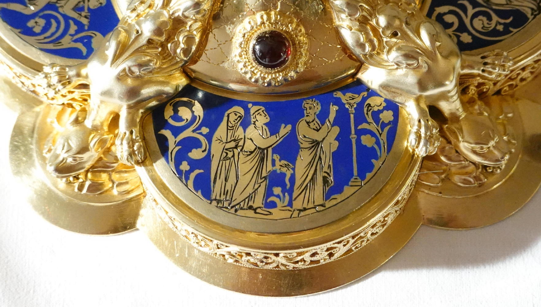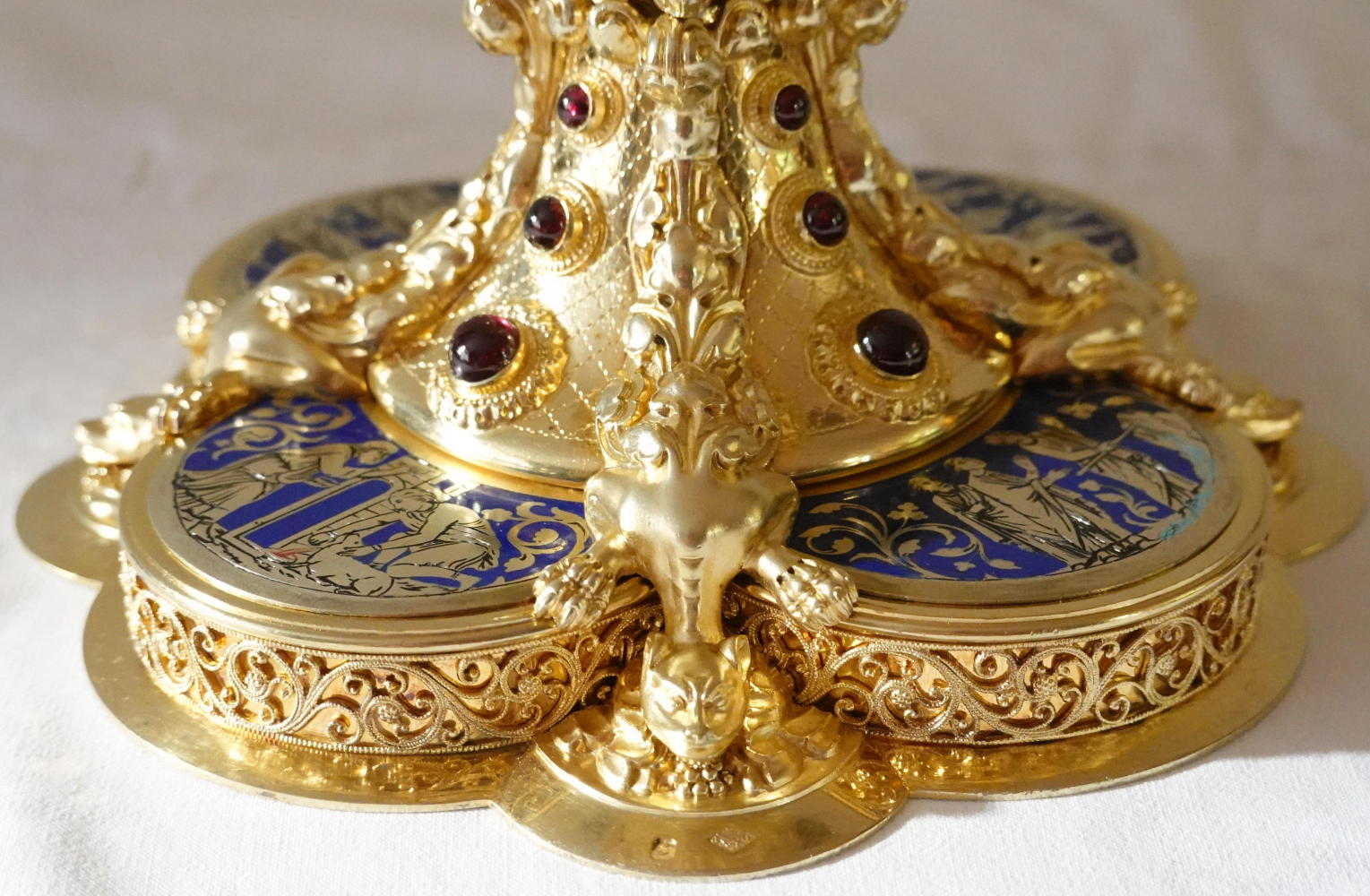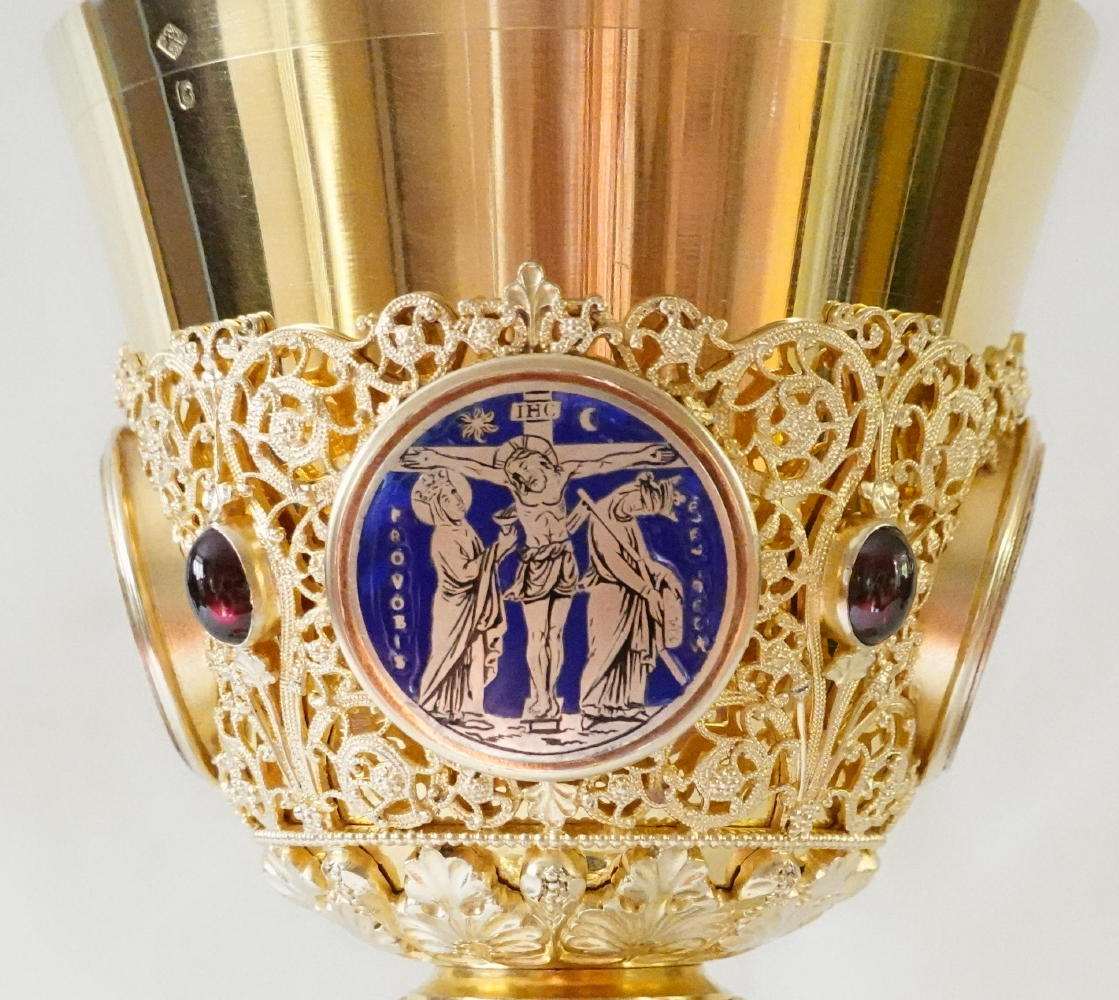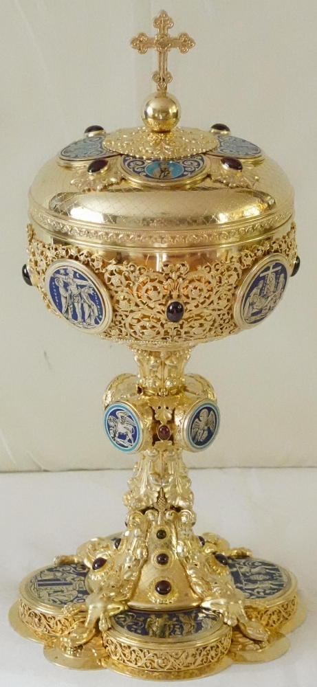 The Chalice and Ciborium are both finished with fine filigree work throughout, numerous deep blue and gold enamels, gargoyles and coloured stones.