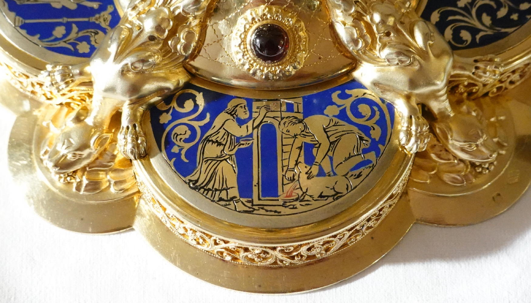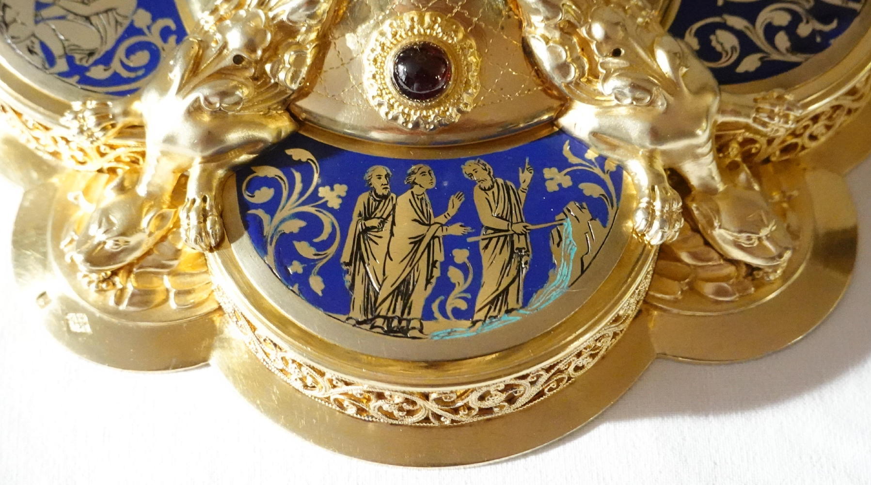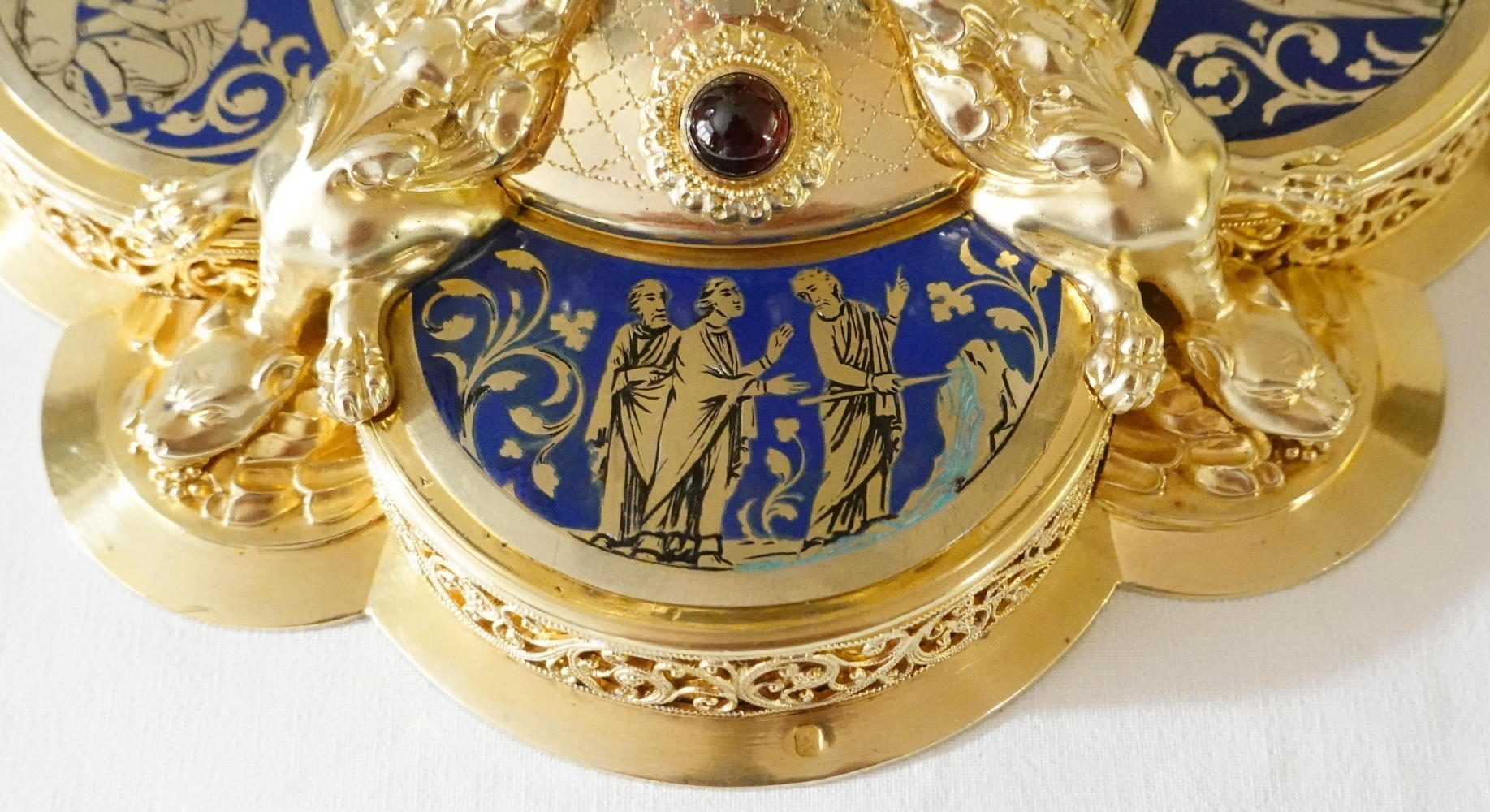 The base of the Ciborium also matches the Chalice, with gargoyles, enamels of Old Testament Scenes, stones and filigree work.