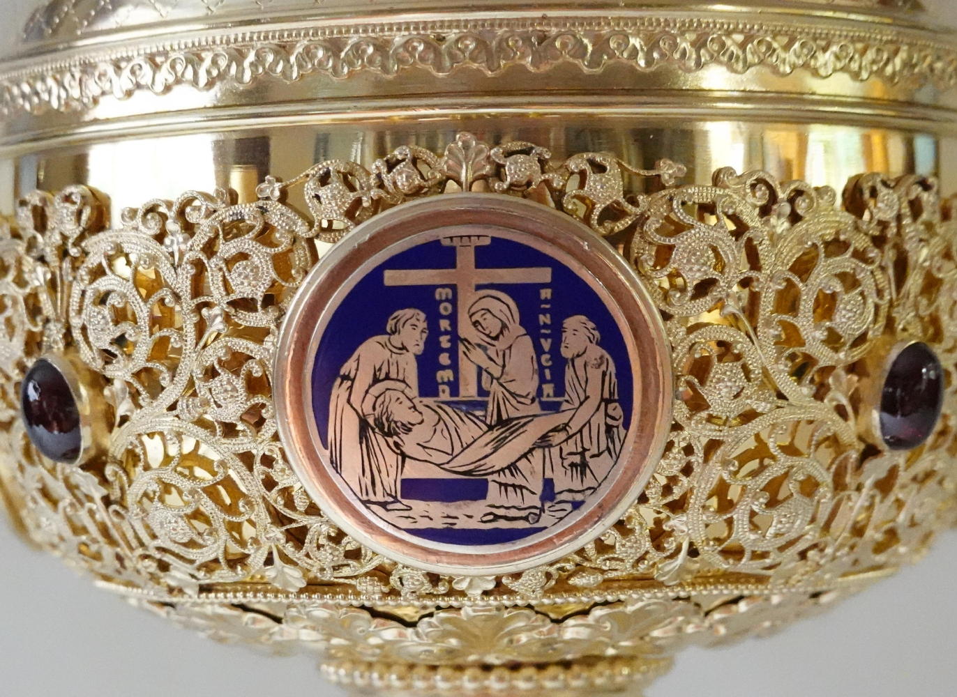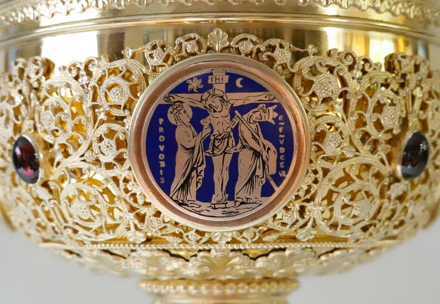 The design of the Ciborium echoes that of the Chalice, with fine filigree work, coloured red stones and enamels.
