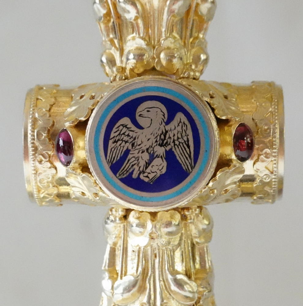 Between the enamels are red stones. In the centre of the lid, the cross is in Gothic style and finished with decorative work.