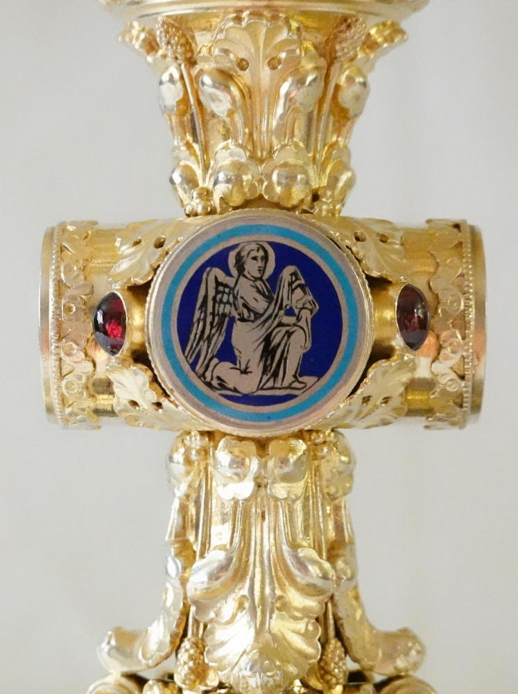 The circular stem is finished with engraving throughout. Central to this is the decorative knop, which is has four large circular lozenges set with enamels depicting the Four Evangelists.