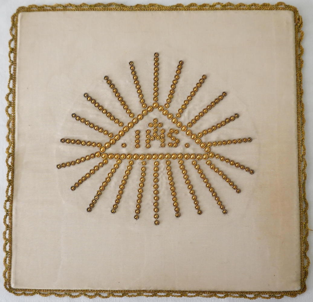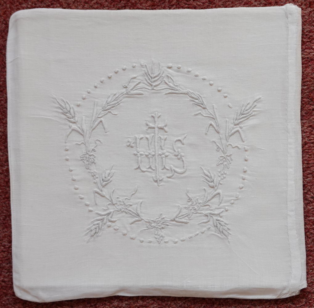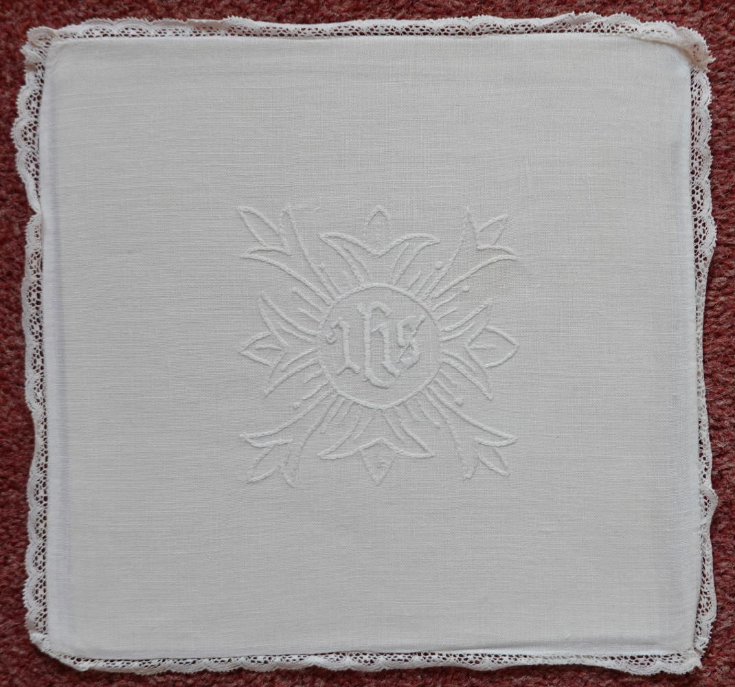 We usually have a variety of second-hand Altar Linens in stock. These currently include Purificators, Corporals, Lavabo Towels, Palls, both plain and with embroidery or lace. Below are items from our current stock, but our stock does change all the time, so please contact us for up to date details of availability.