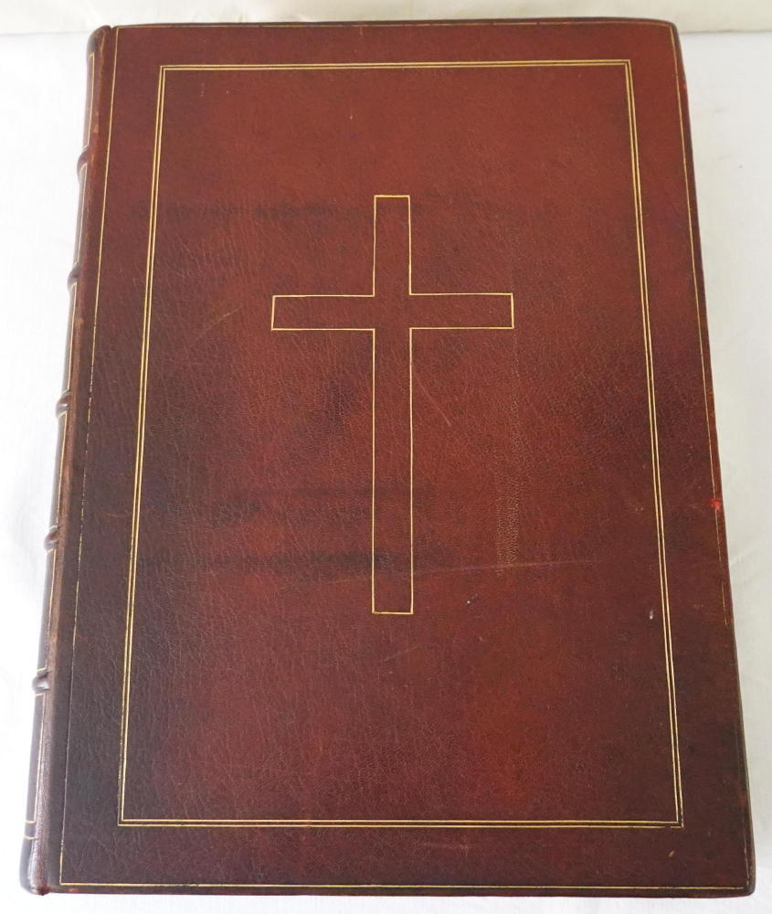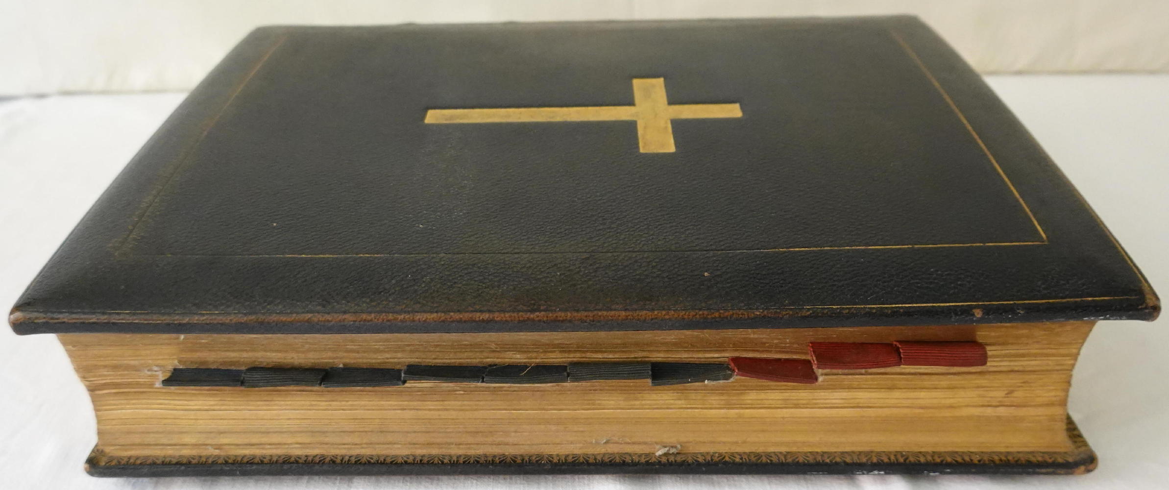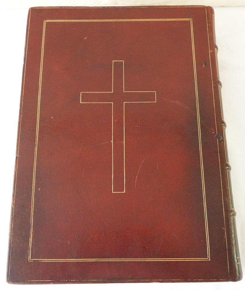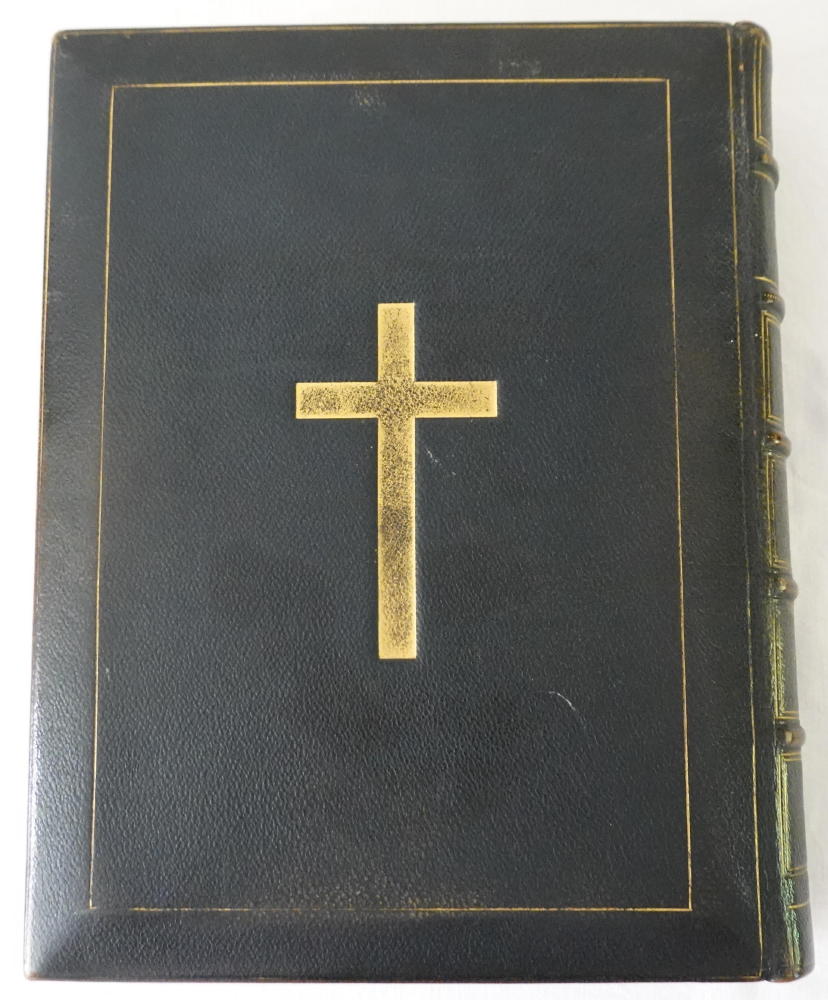 Leather bound with decorative cross to front & back. Gilt edged pages.