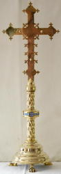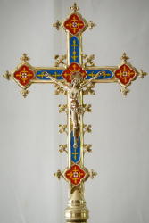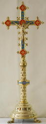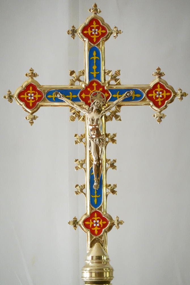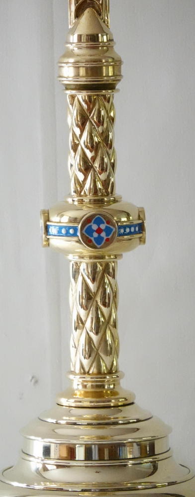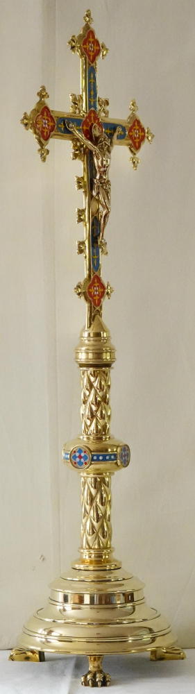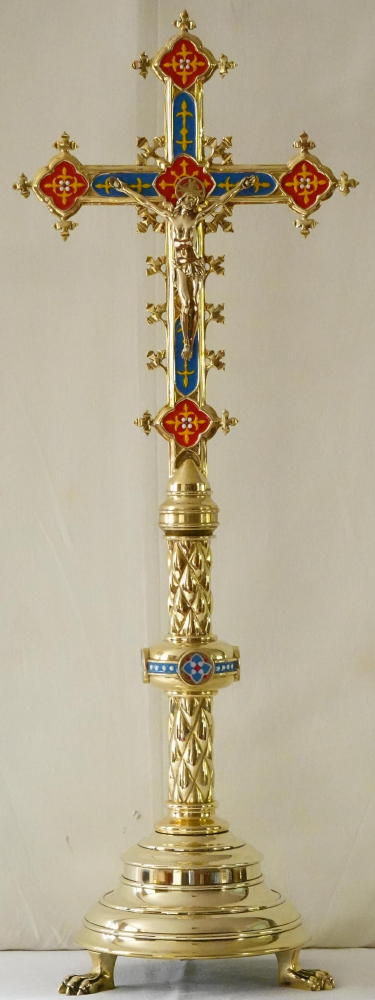 Ref 9038. Brass Gothic Altar Cross, richly finished with coloured enamels and decorative work.