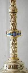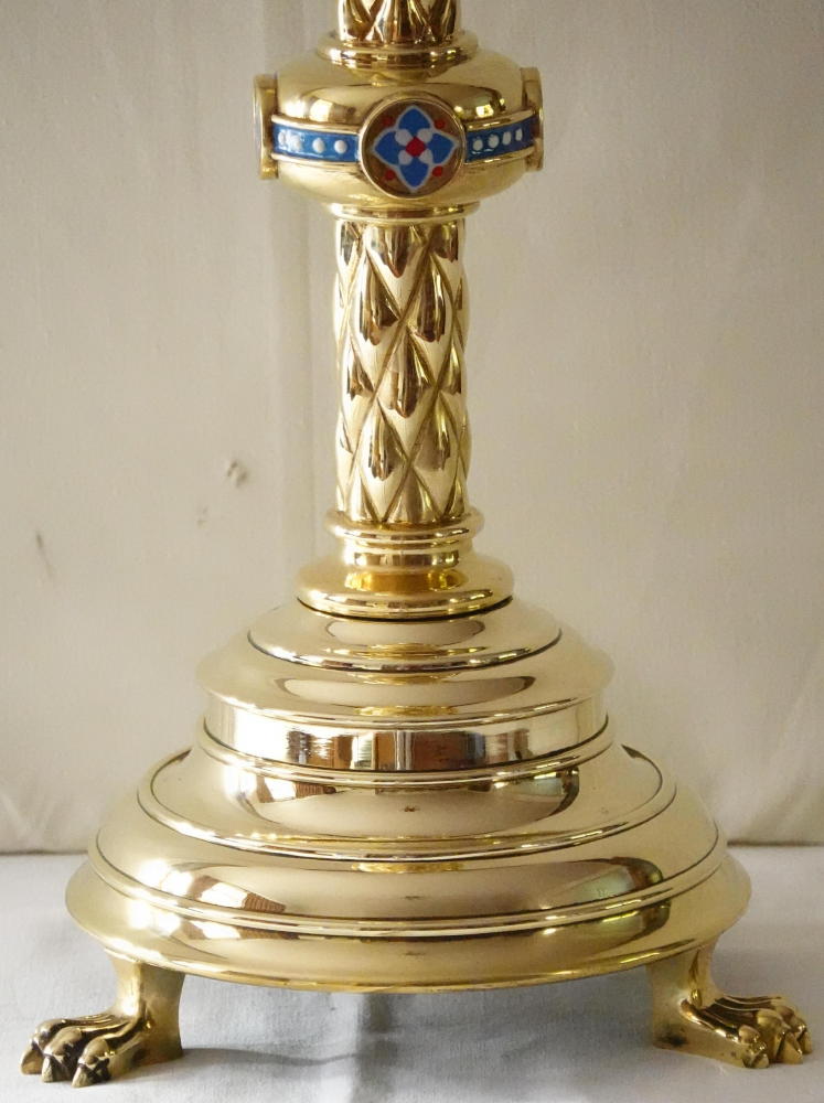 Victorian Gothic in the style of Hardman's workshop, with enamels to the knop, barley twisted stem, castellated tops and clawed feet.