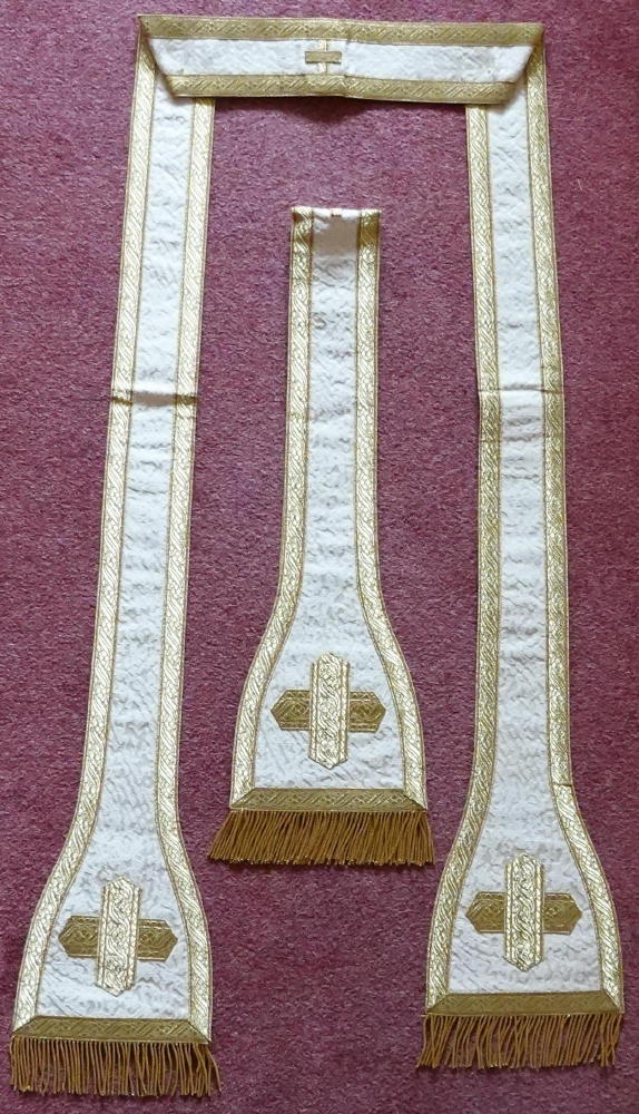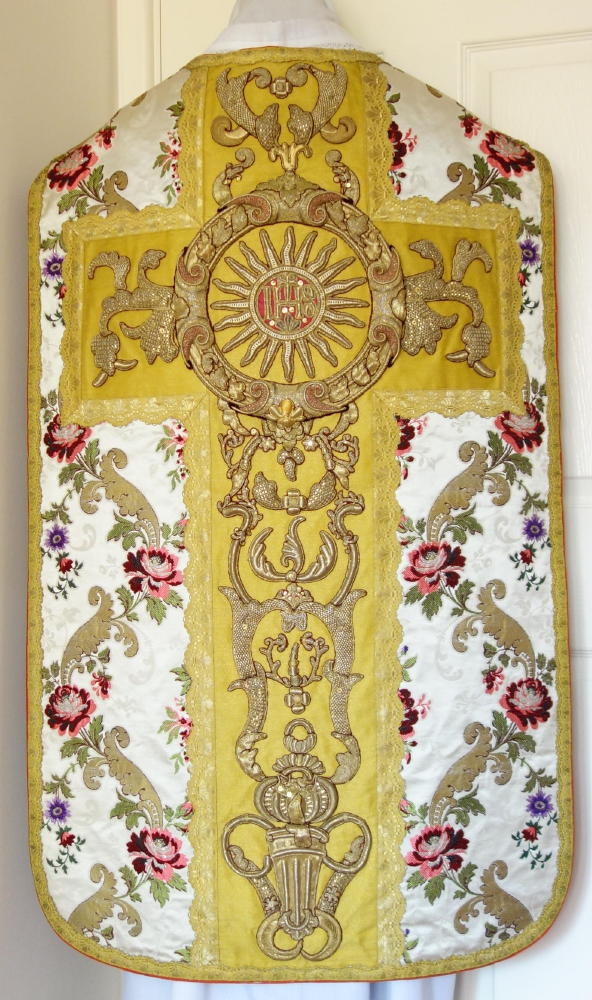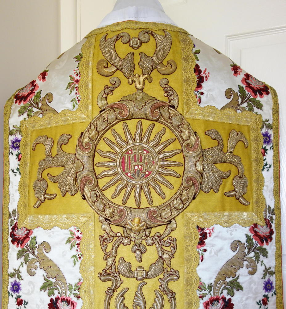 Orphreys on ribbed ivory silk worked in gold bullion embroidery throughout with central sunburst IHS to back.