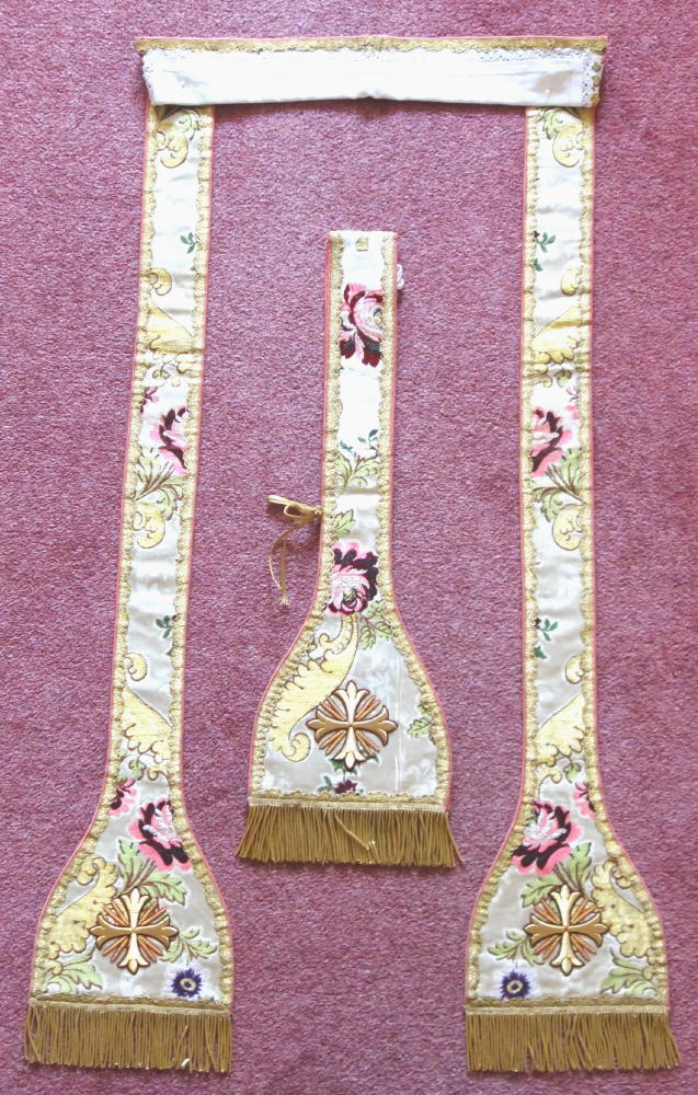 5 pieces, all finished with embroidery: Chasuble, Stole, Maniple, Chalice Veil & Burse. Price £3,500. (US$4,900)