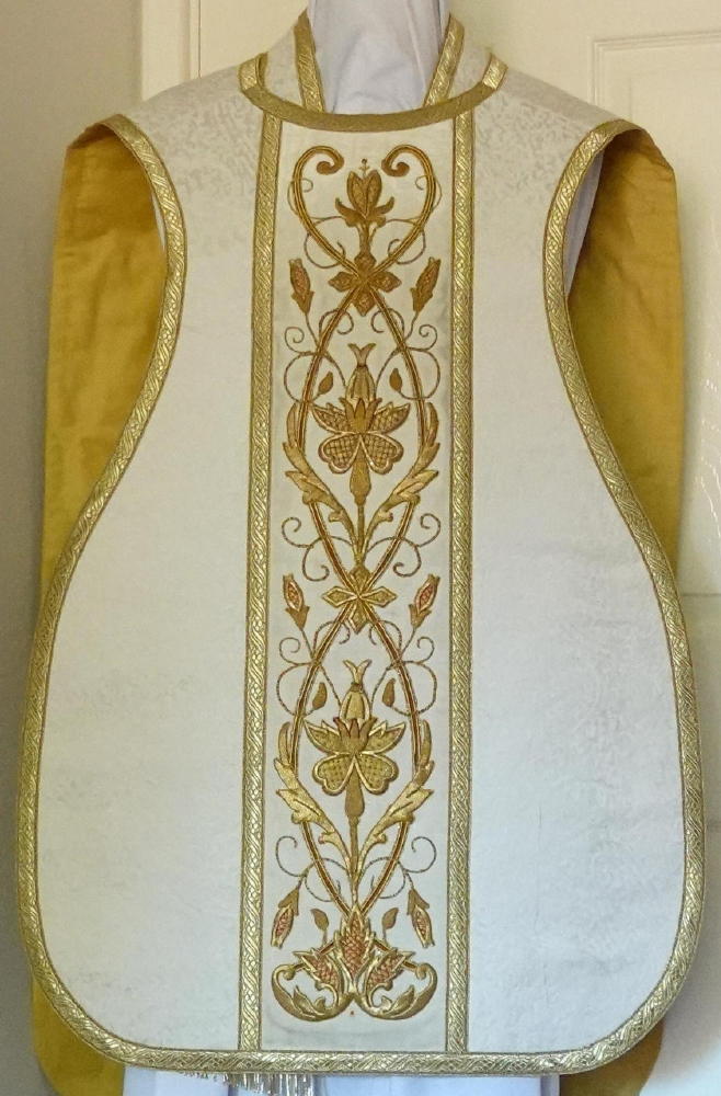Below are some white Low Mass Vestments currently available, but our stock is changing all the time, so please do contact us for up to date information.