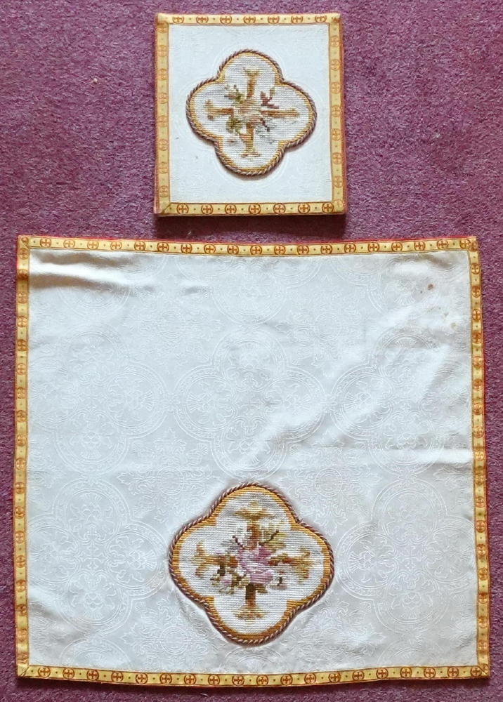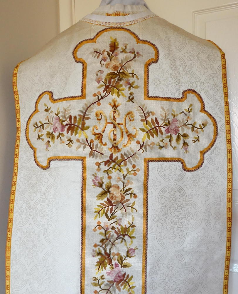 5 matching pieces, all finished with needlepoint: Chasuble, Stole, Maniple, Chalice Veil & Burse. Price £995. (US$1,395)