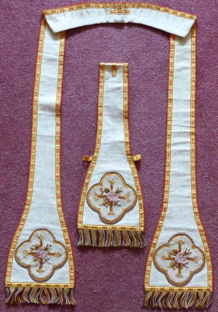 Orphreys worked in coloured needlepoint floral designs with central IHS to back. Coloured silk braids and fringe to finish.
