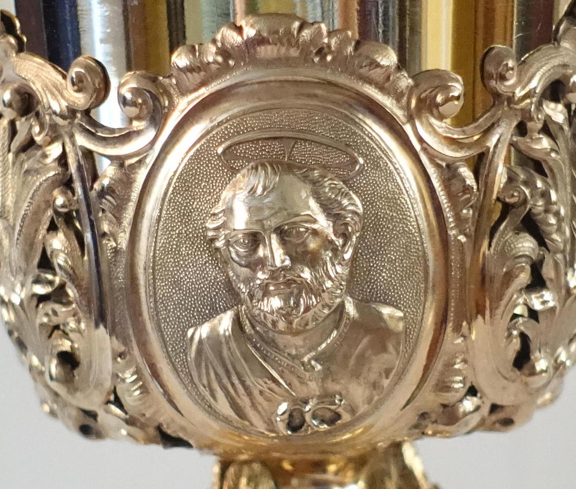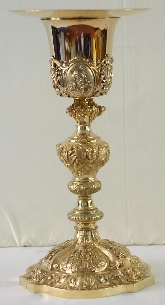 The Calix has three oval roundels depicting Our Lord, St Peter and St Paul. Between these are Eucharistic symbols of Grapes, Wheat and bulrushes.