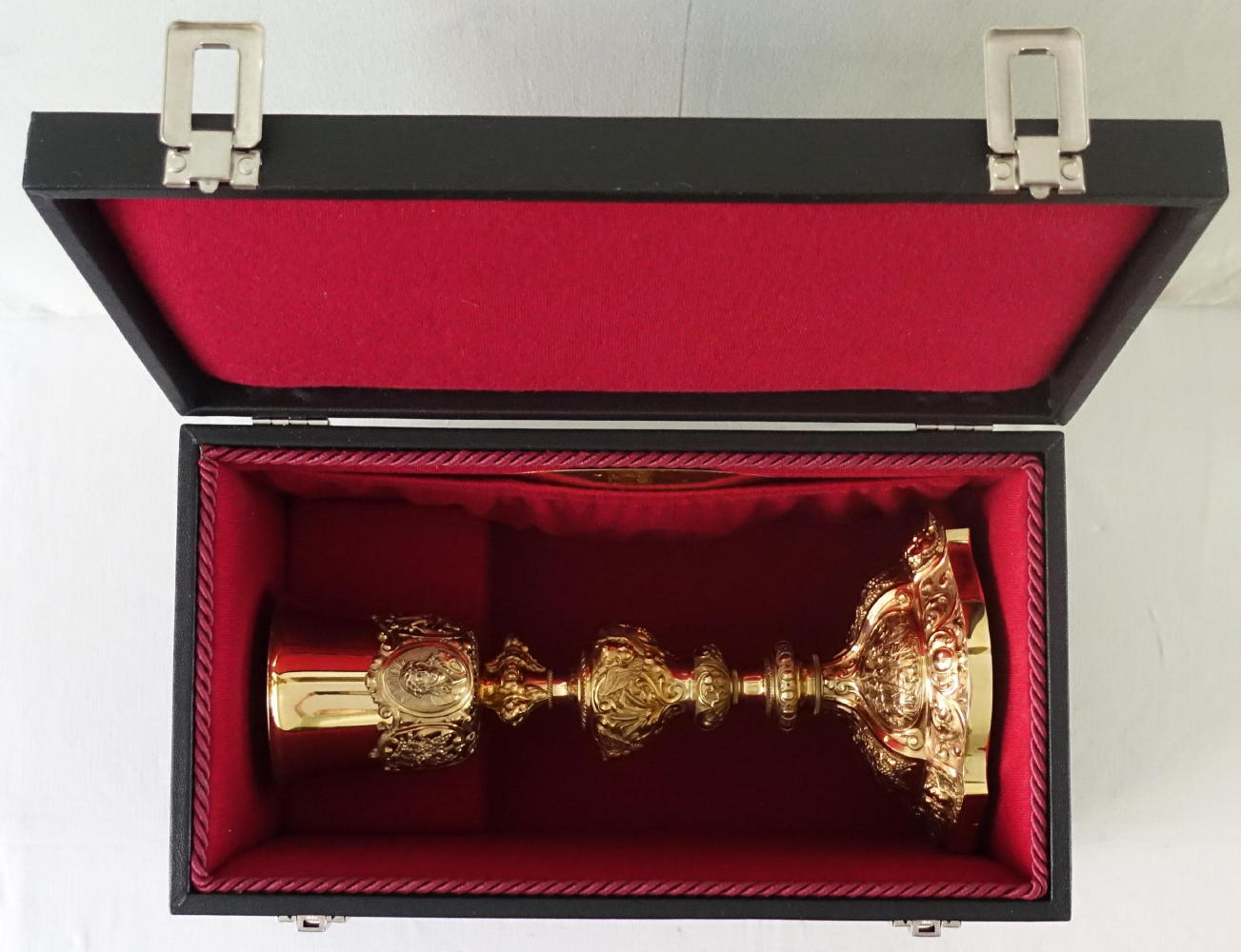 Chalice comes with matching solid silver gilt well-design Paten. The centre of Paten has a large raised scene of The Crucifixion with two Angels and the Crown of Thorns.