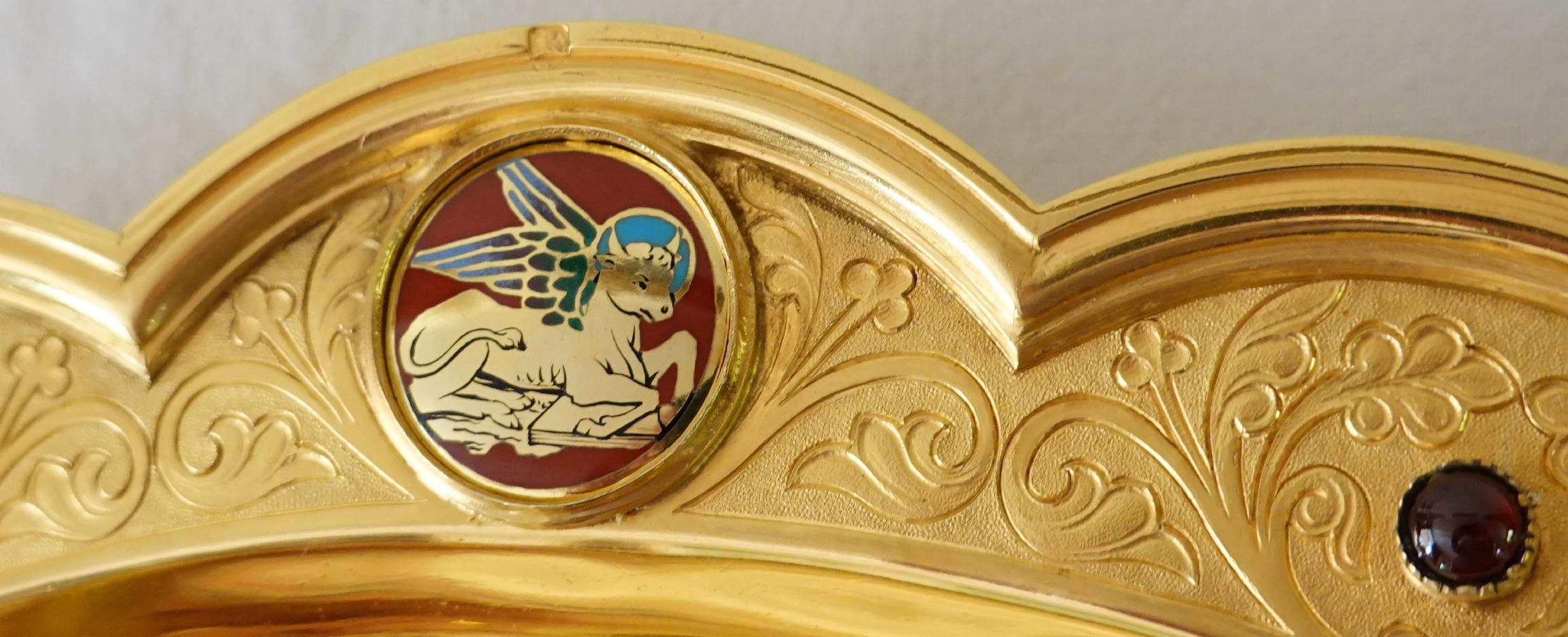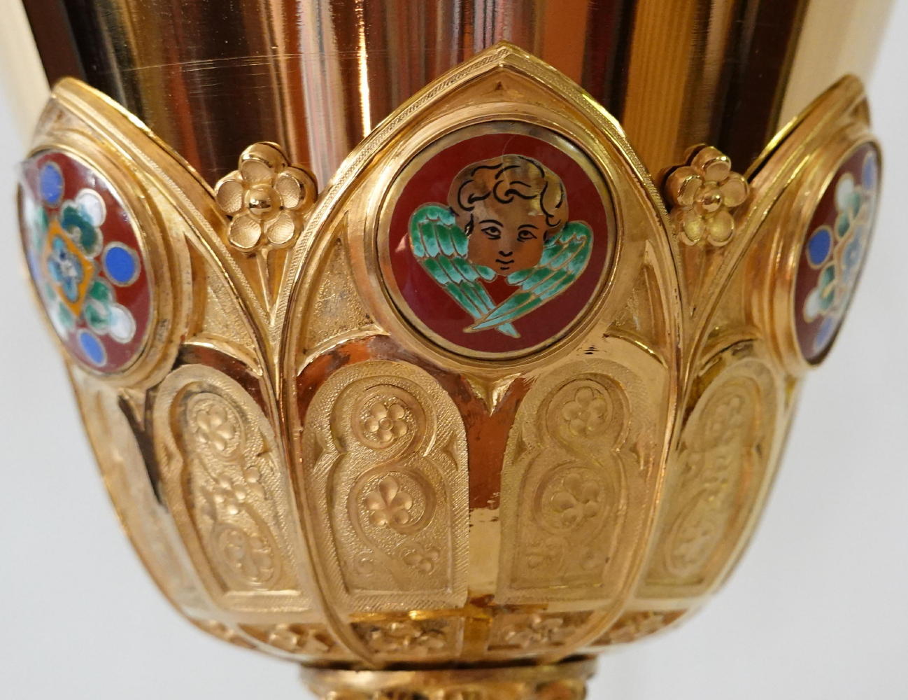 Round the casing work are four circular coloured enamels, alternating between Gothic style crosses and Angels, reflecting the same work as on the Calix of the Chalice.