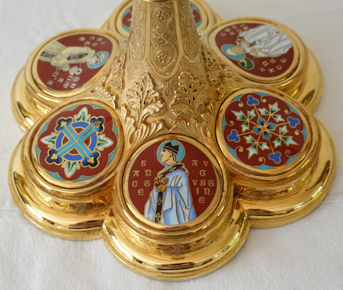 The hexafoil petalled base is finished with fine detail. On each petal is a large coloured circular enamel. These depict St Gregory, St Augustine and St Thomas. The remaining three enamels are colourful Gothic style crosses.