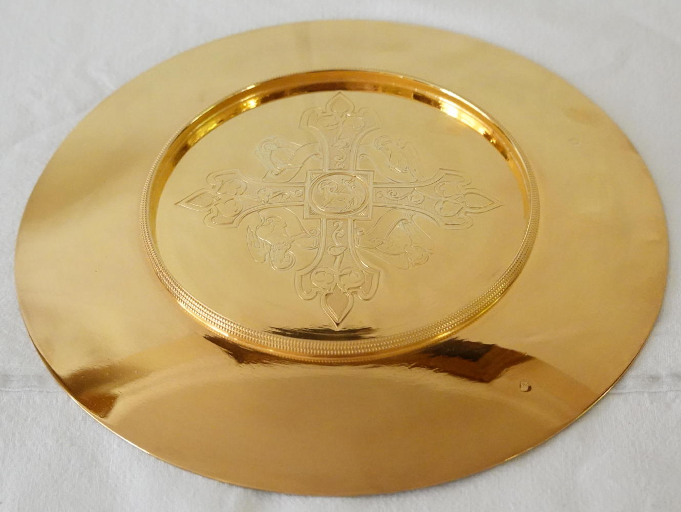 The matching well design Paten has a central engraving of a stylish Gothic Cross with a central Agnus Dei. It fits the Chalice well.