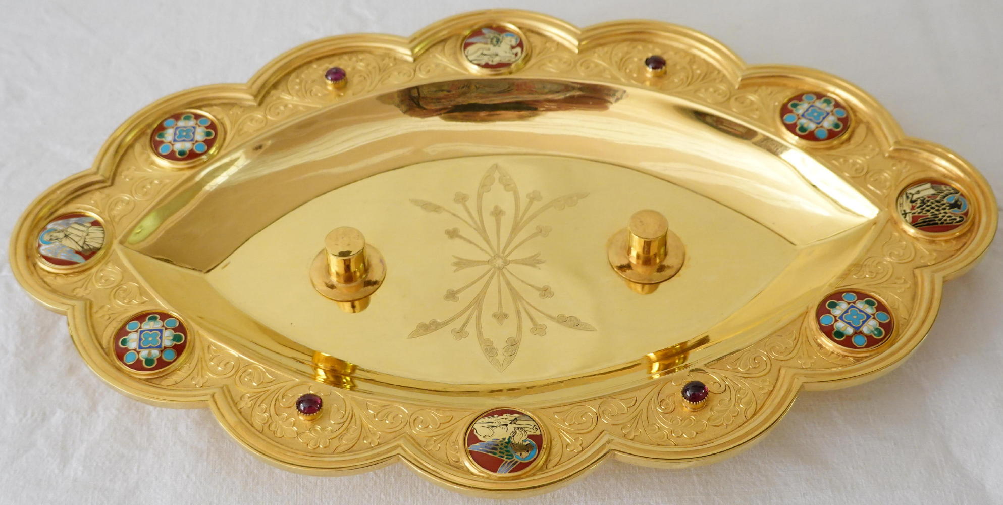 The tray is gilded all over. It is finished with fine engraving work round the edge and to the centre. This is set with eight circular coloured enamels depicting the Four Evangelists with colourful Gothic crosses between. Small red stones to finish.