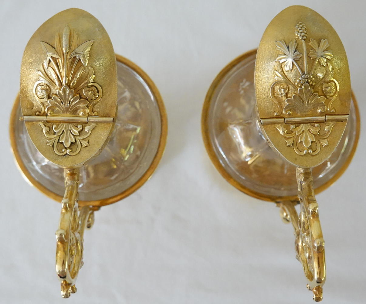 The silver casing is gilded all over. The lids and the casing work are finished with grapes and bulrushes to differentiate them.