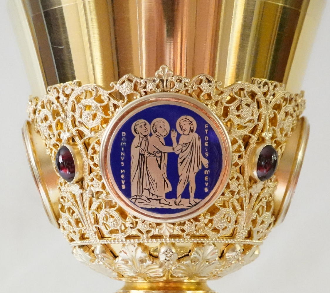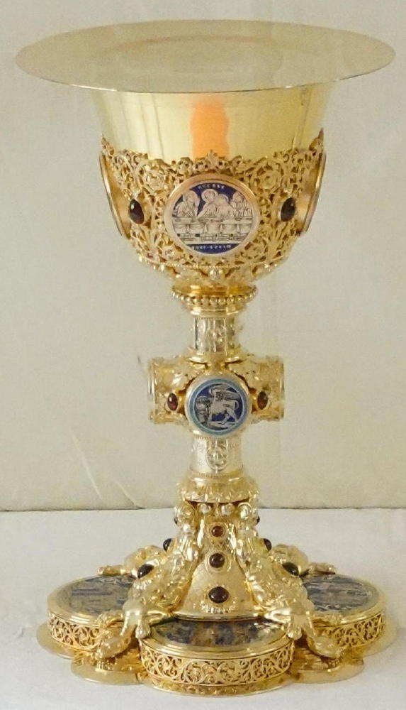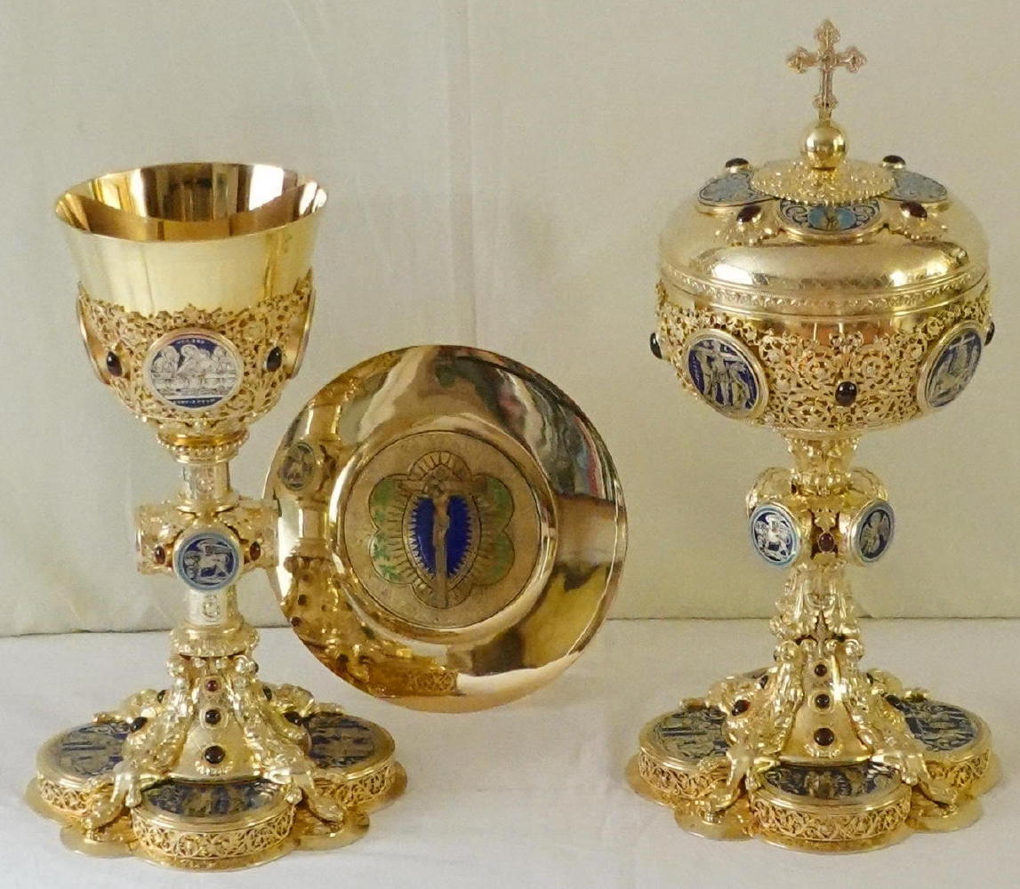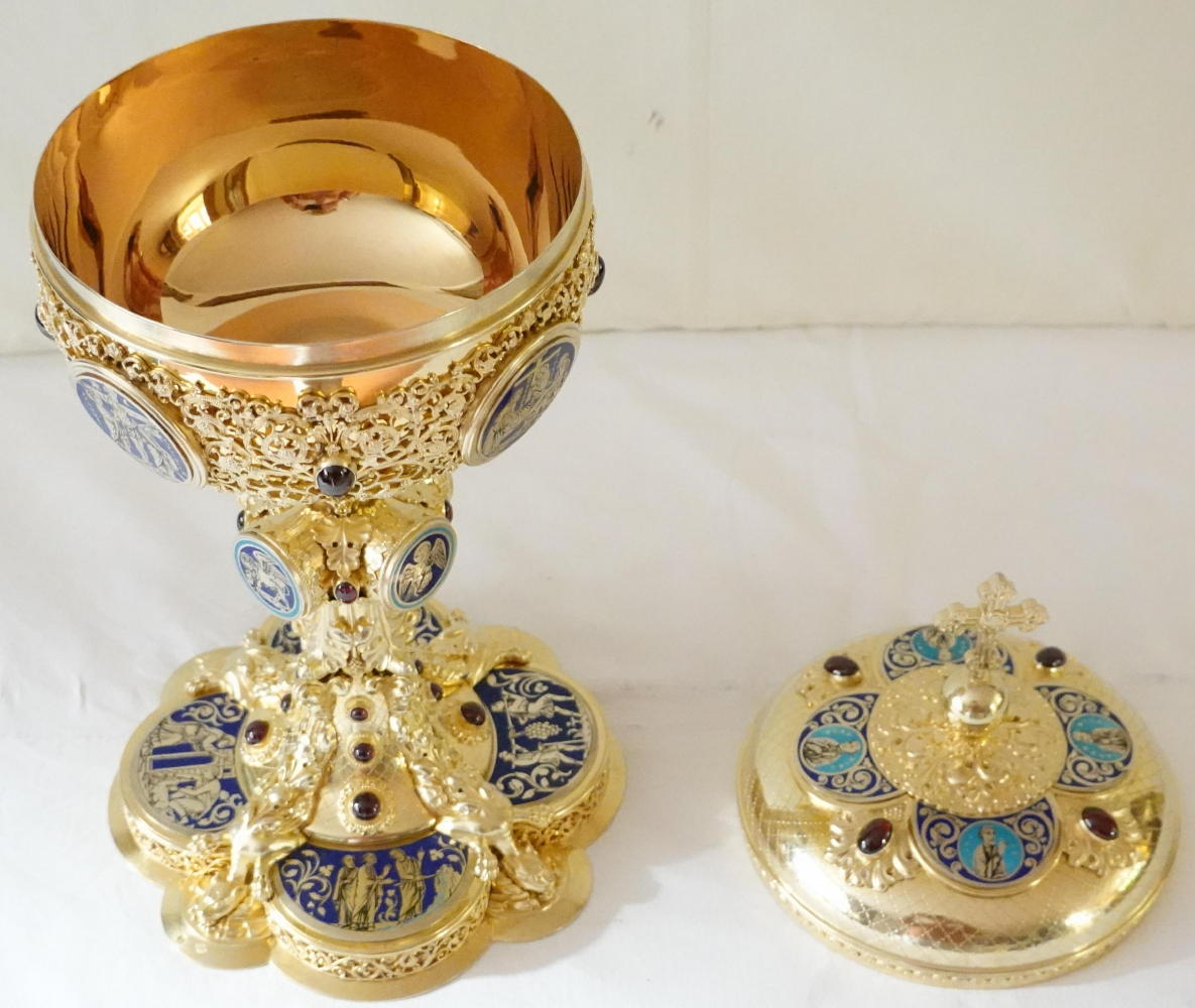 The Chalice and Ciborium are both finished with fine filigree work throughout, numerous deep blue and gold enamels, gargoyles and coloured stones.