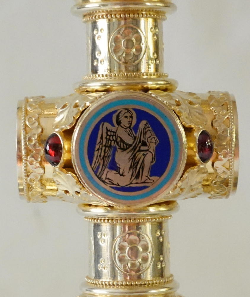 Between the enamels are red stones. In the centre of the lid, the cross is in Gothic style and finished with decorative work.