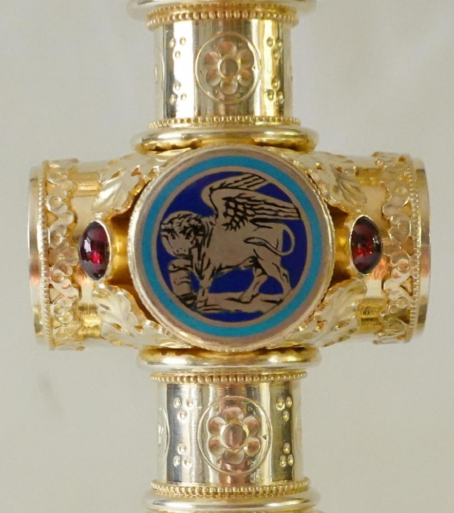The circular stem is finished with engraving throughout. Central to this is the decorative knop, which is has four large circular lozenges set with enamels depicting the Four Evangelists.