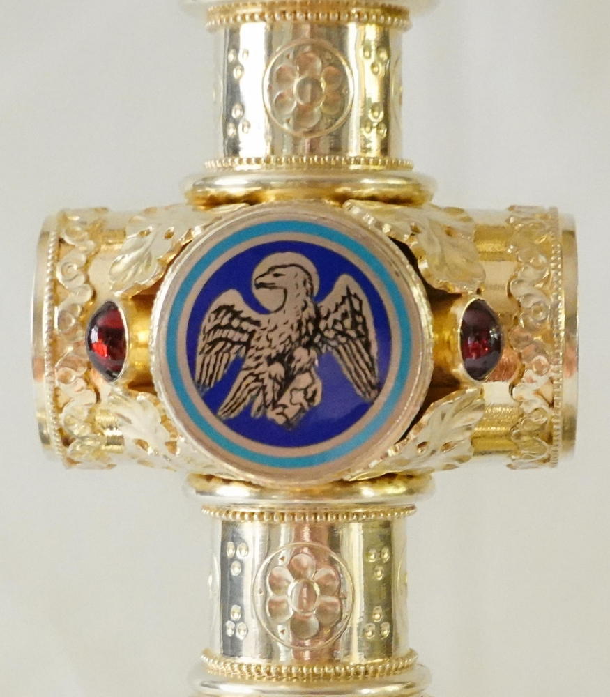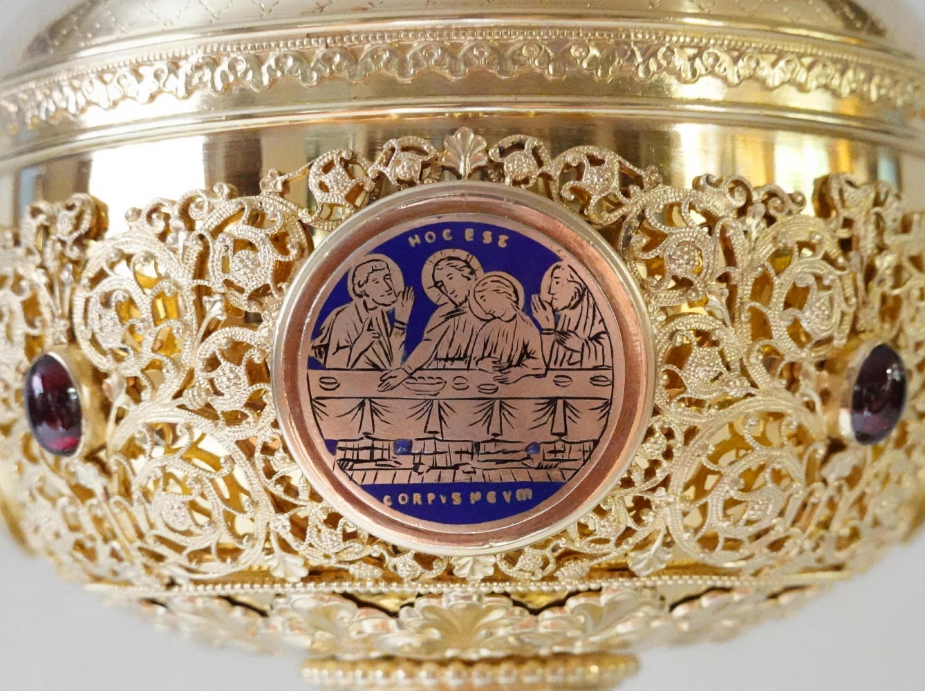 The design of the Ciborium echoes that of the Chalice, with fine filigree work, coloured red stones and enamels.