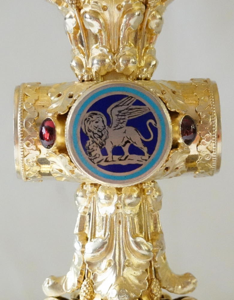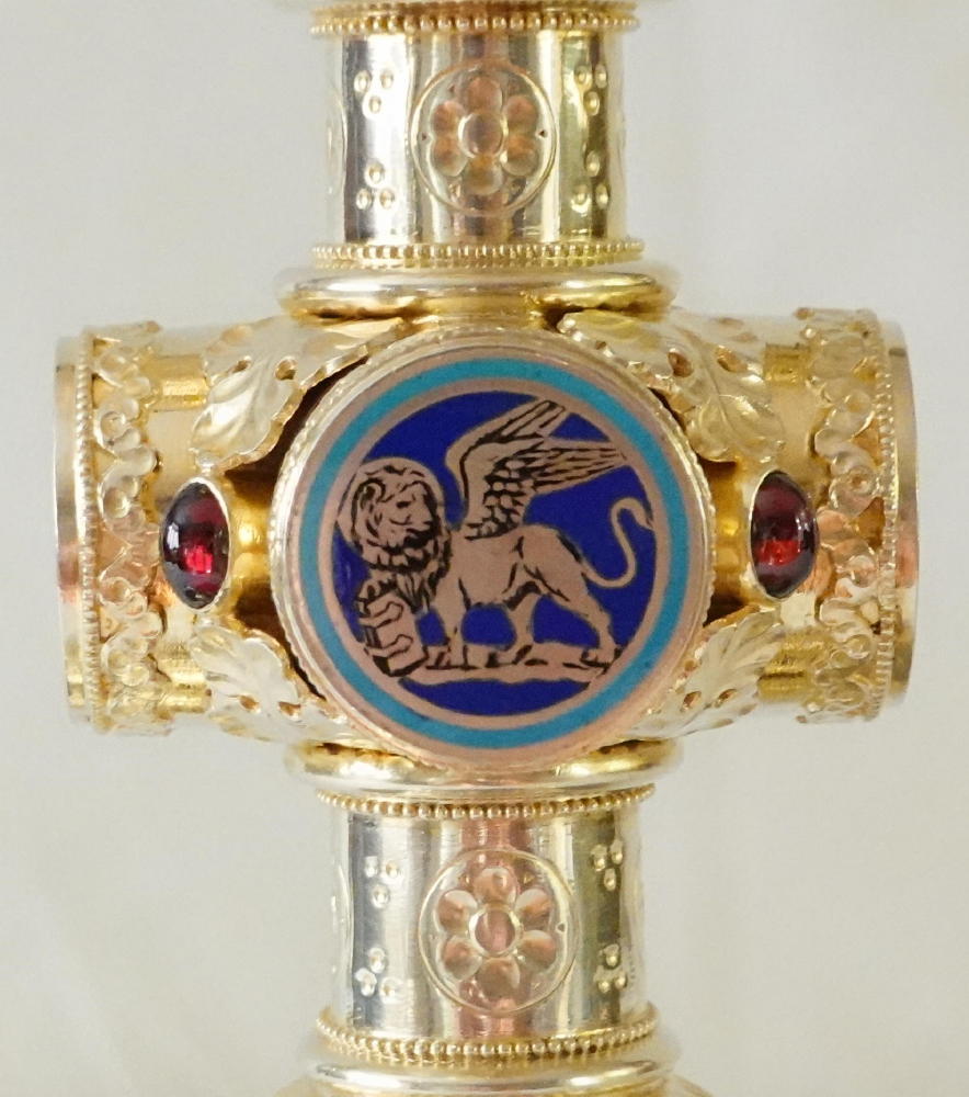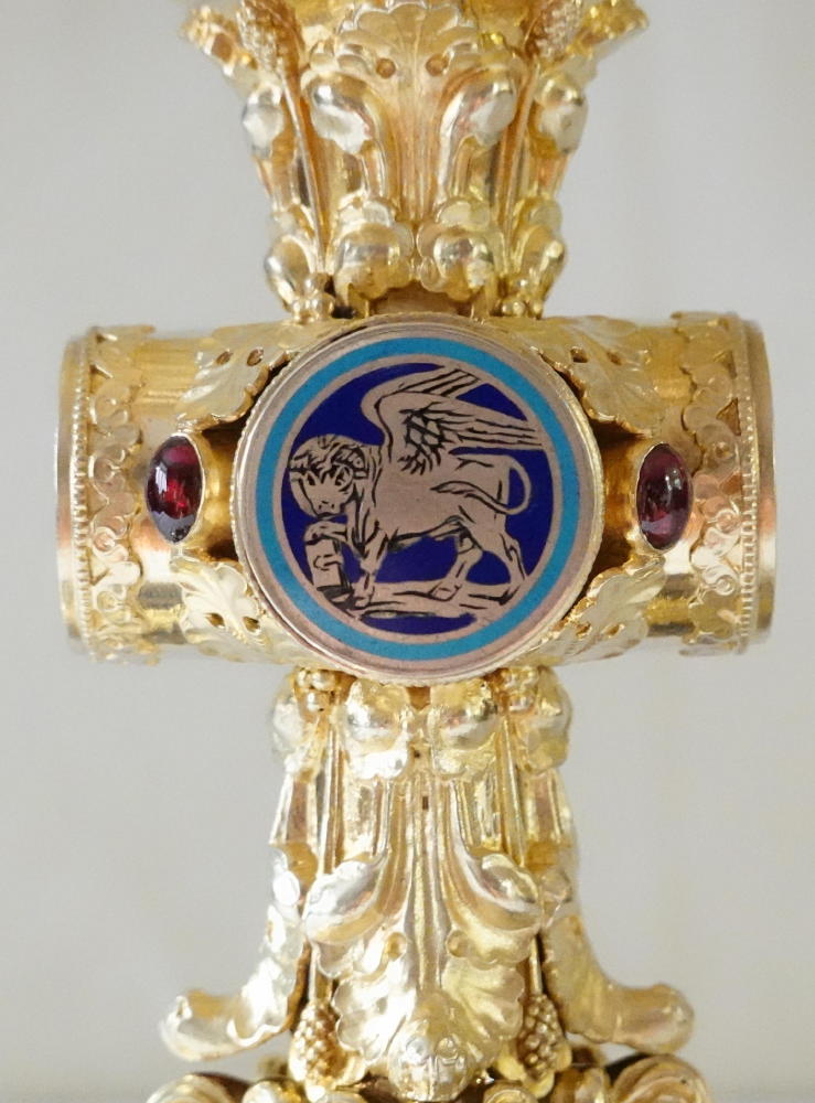 The circular stem is finished with rich, raised decoration, and the central knop has the identical finish and enamels to that of the Chalice.