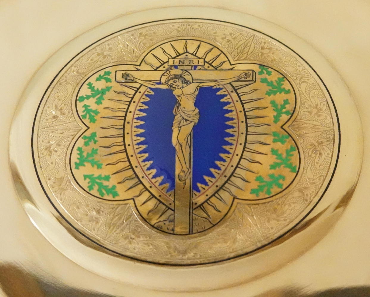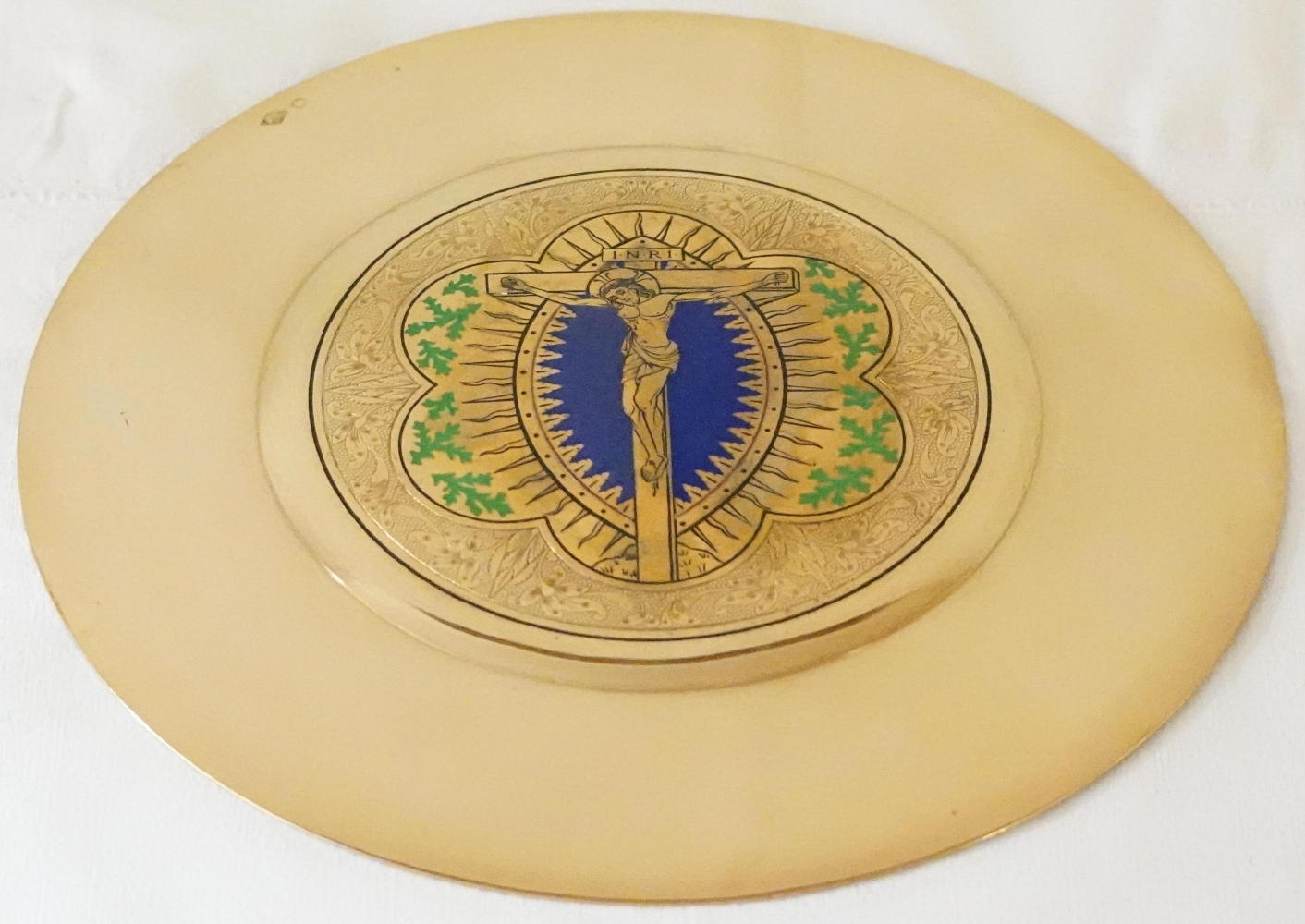 The matching well design Paten has a large enamel to the centre of the Crucifixion, finished with fine engraving.