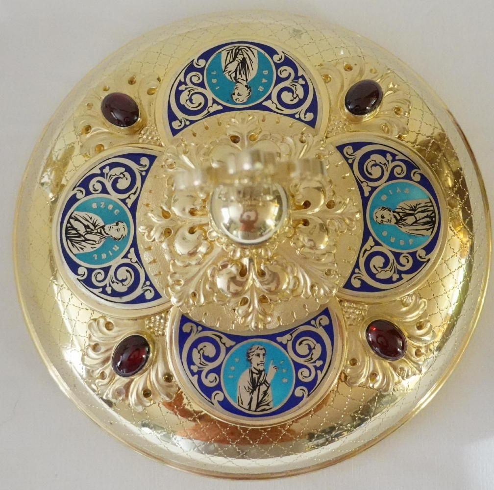 The circular lid on top of the Ciborium is finished with fine engraving to the edge. the centre-piece has four semi-circular enamels, each depicting a Prophet: Isiah, Jeremiah, Daniel and Ezekiel.