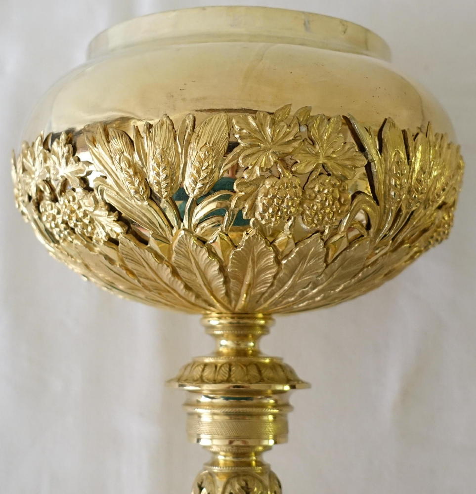 The calix to the bowl is made in bunches of wheat and grapes, with leaves below.