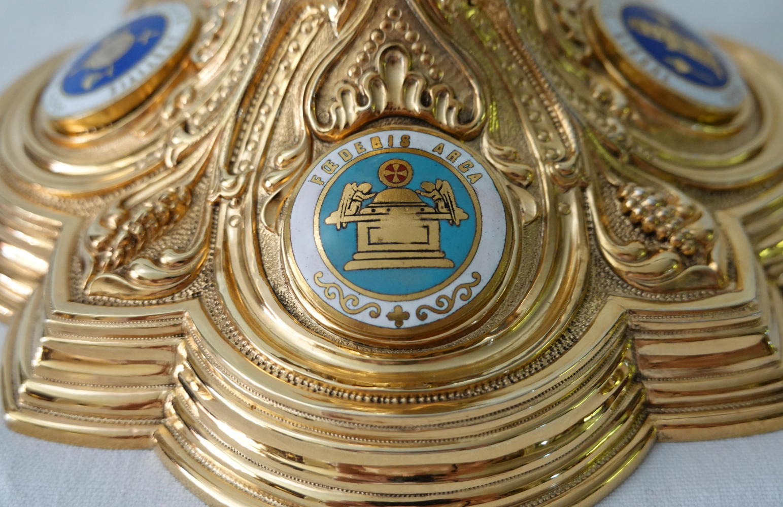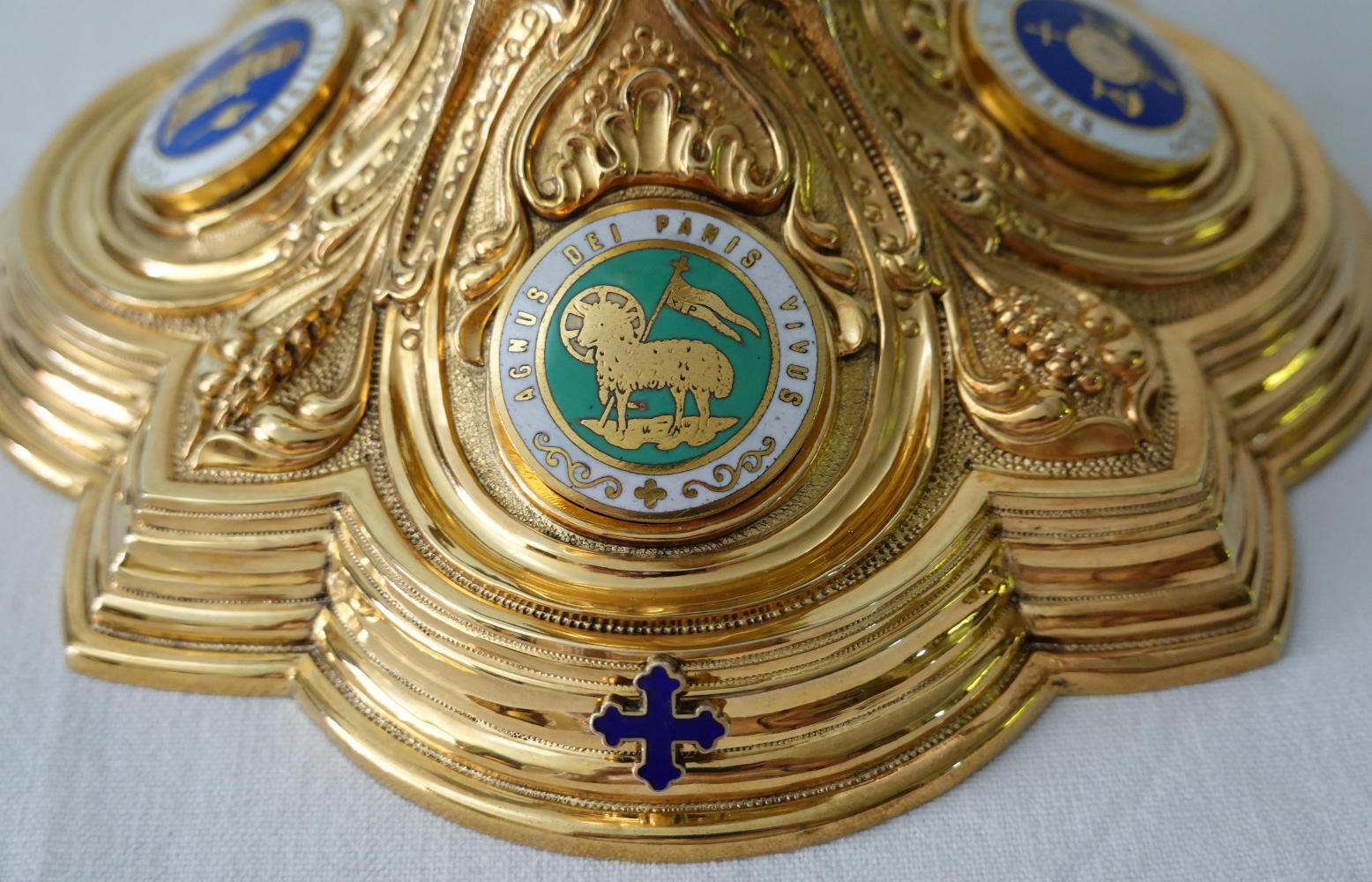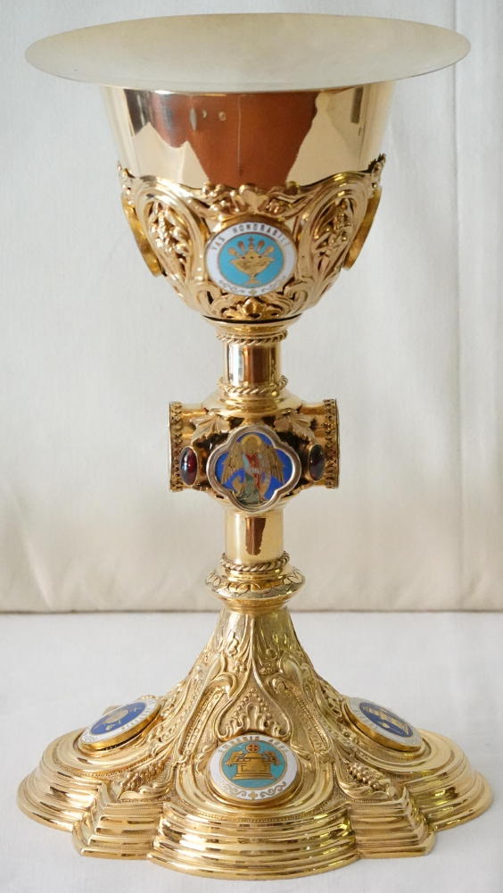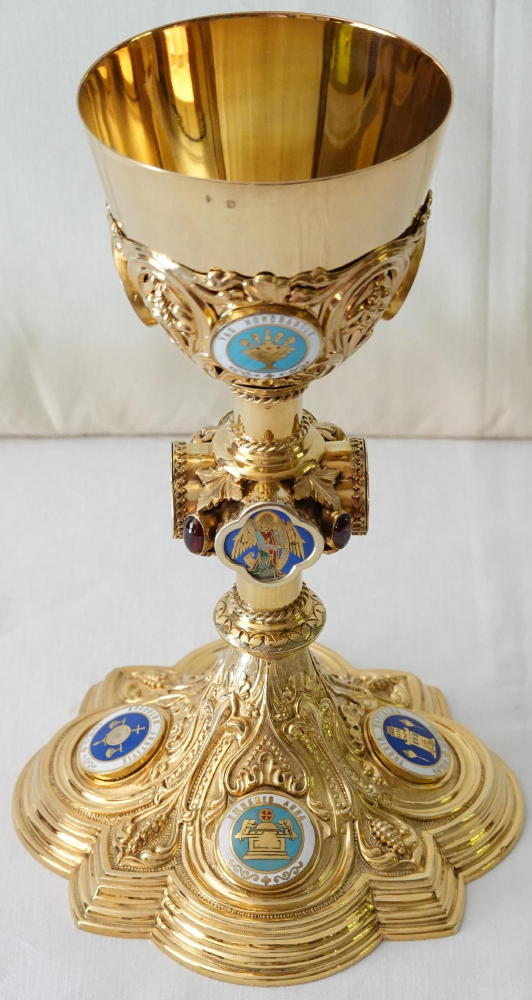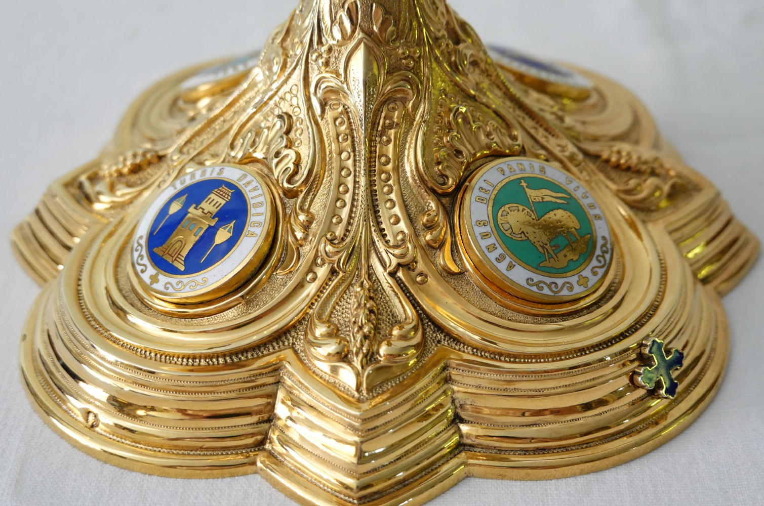 The calix to the cup has sheaves of wheat in its design. Four circular enamels depict themes from the Litany of Loreto: 'cedrus exaltata', 'vas spirituale', 'fons hortorum' and 'vas honorabile'.