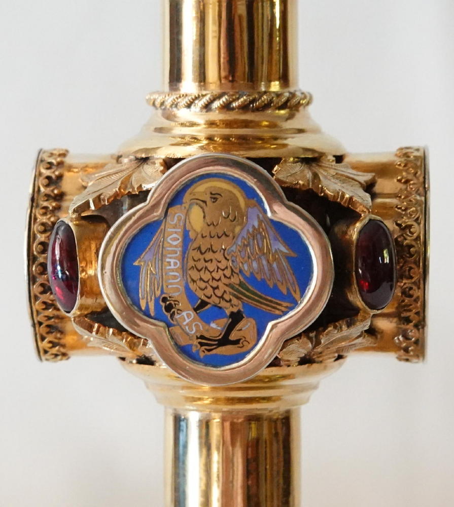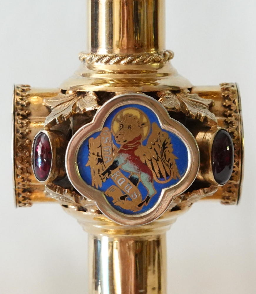 The large central knop has four quatrefoil shaped enamels depicting the Four Evangelists, with large oval coloured stones between.