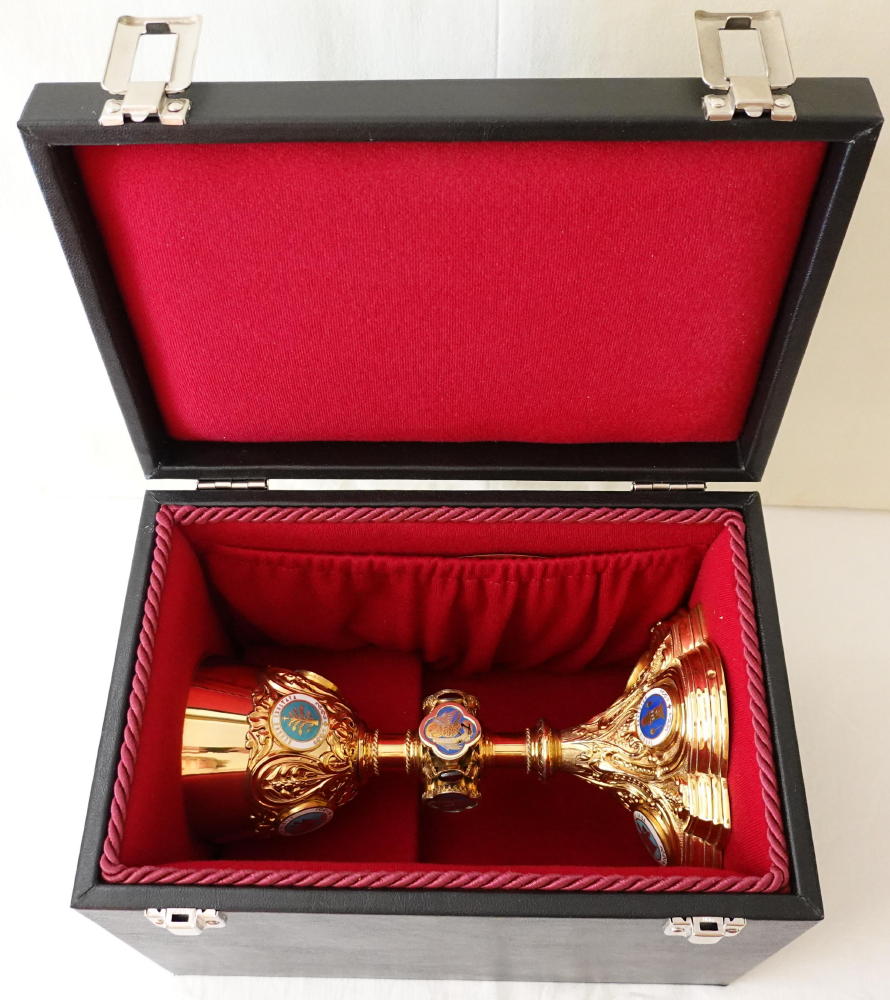 The blending well shaped Paten is also made in solid silver gilt and fits the Chalice well. It has a finely engraved Marian design of a Cross with M at the base.