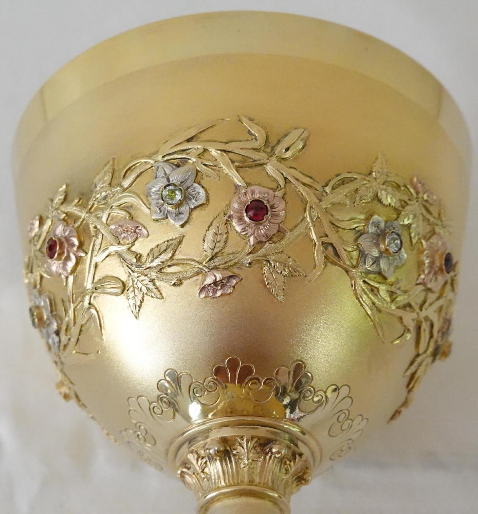Round the cup is worked a raised frieze of flowers and foliage, set with small coloured stones.