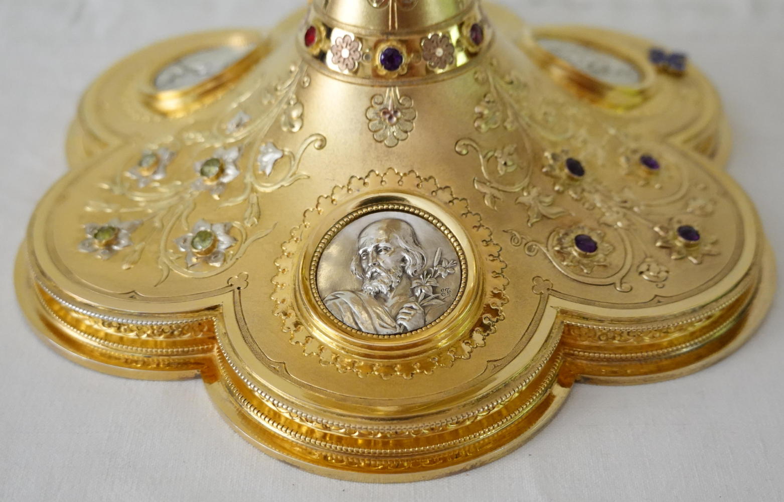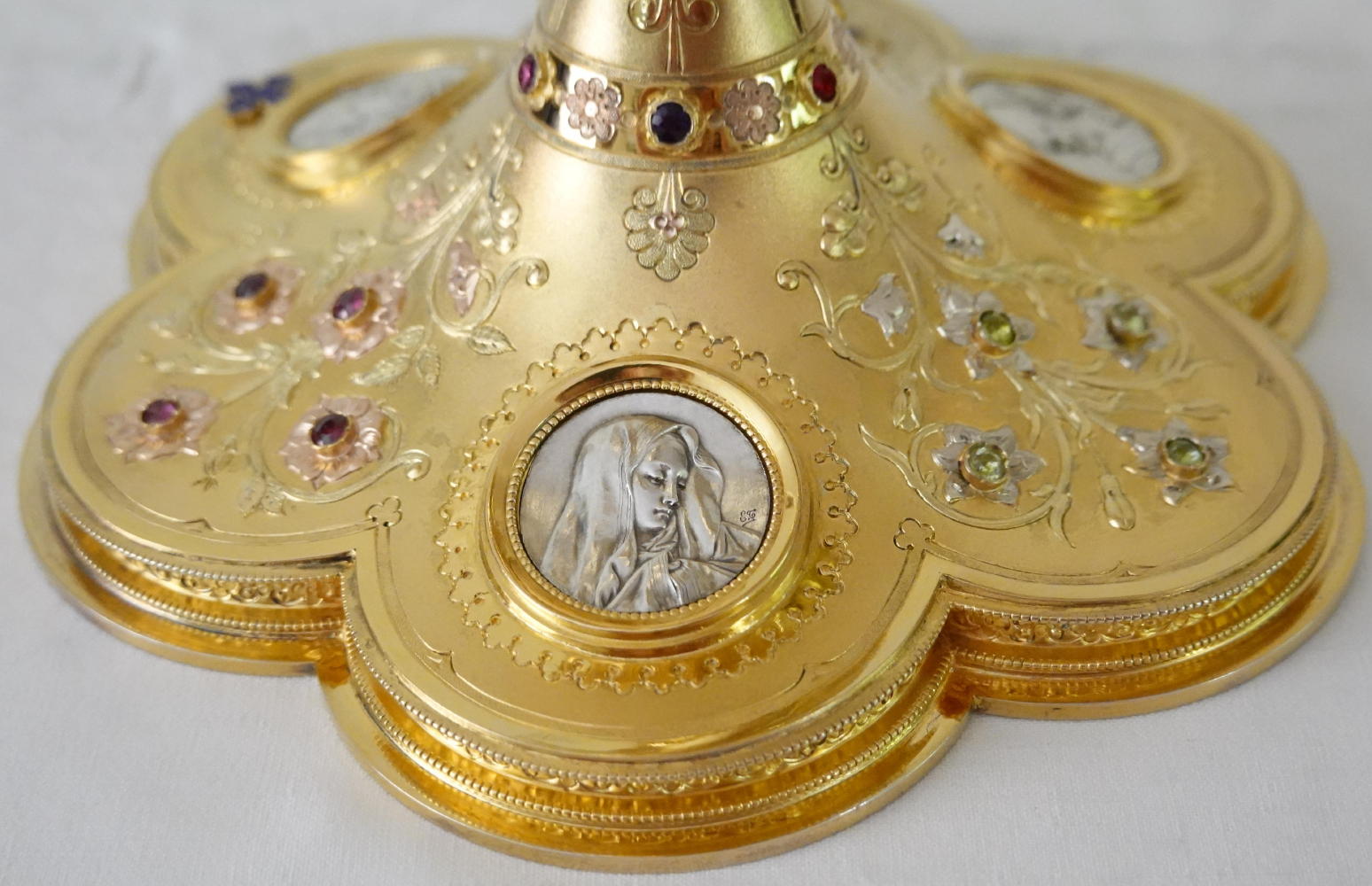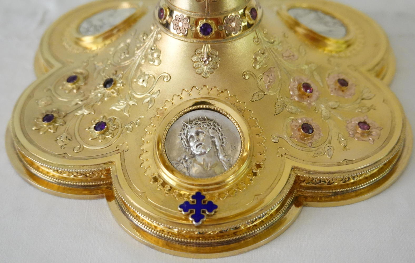 Between these are raised flowers set with small coloured stones. To one side is a blue enamelled cross.