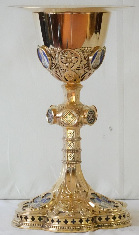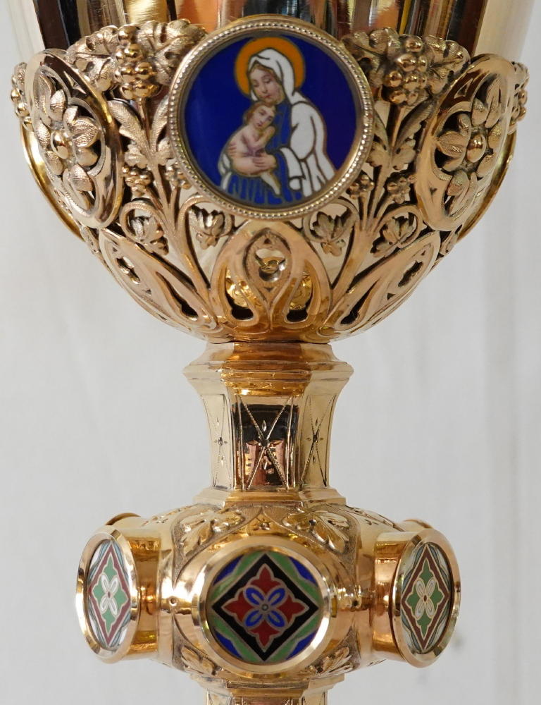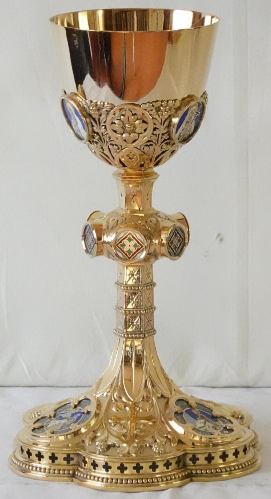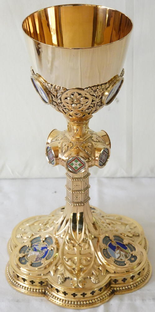 Both the Chalice and the Paten are made in solid silver, gilded throughout.