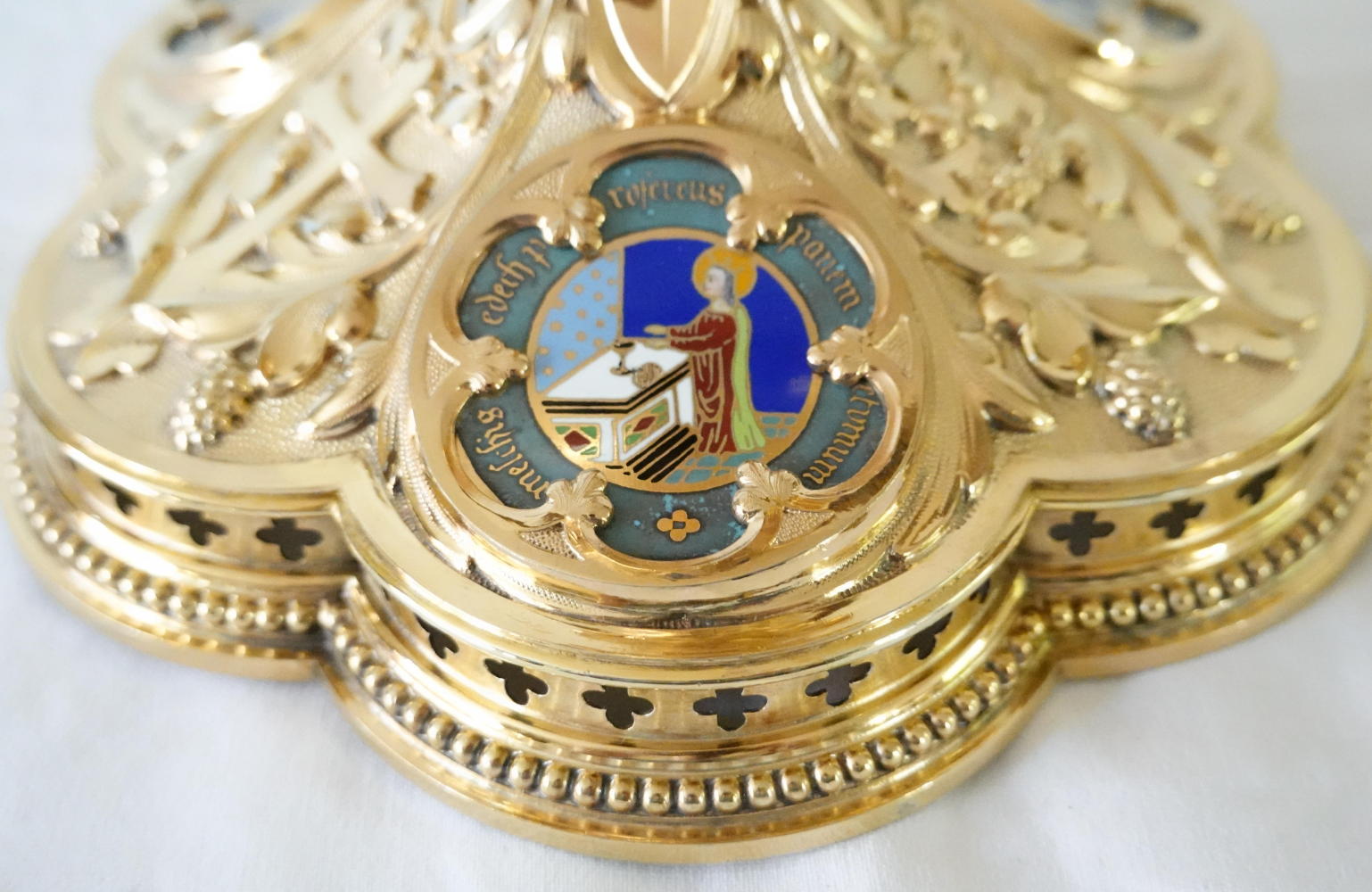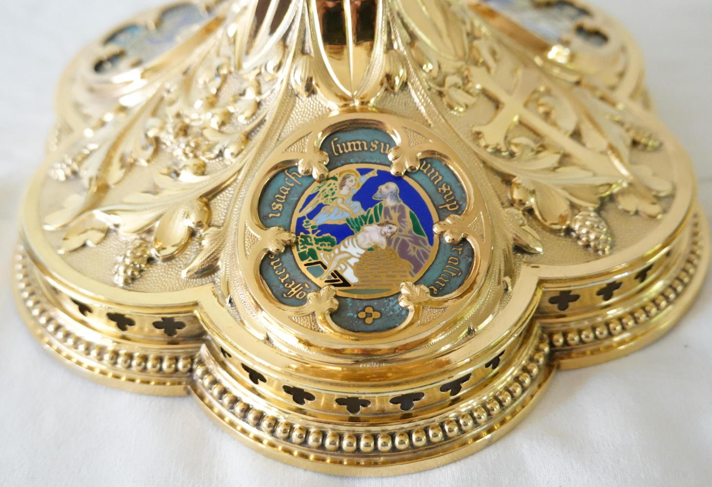 The hexafoil petalled base has rich decoration incorporating grapes of the vine with a large cross to one petal. Three petals have large circular coloured enamels, connecting The Sacrifice of Abraham & Isaac with the Sacrifice of the Mass.
