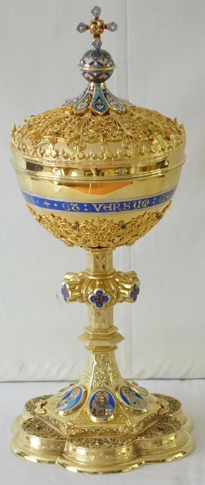 The bowl has a calix made in filigree work, set with further small coloured stones. Above this is a blue and gold enamel with the words 'Et Verbum Caro Factum Est Et Habitavit In Nobis'.