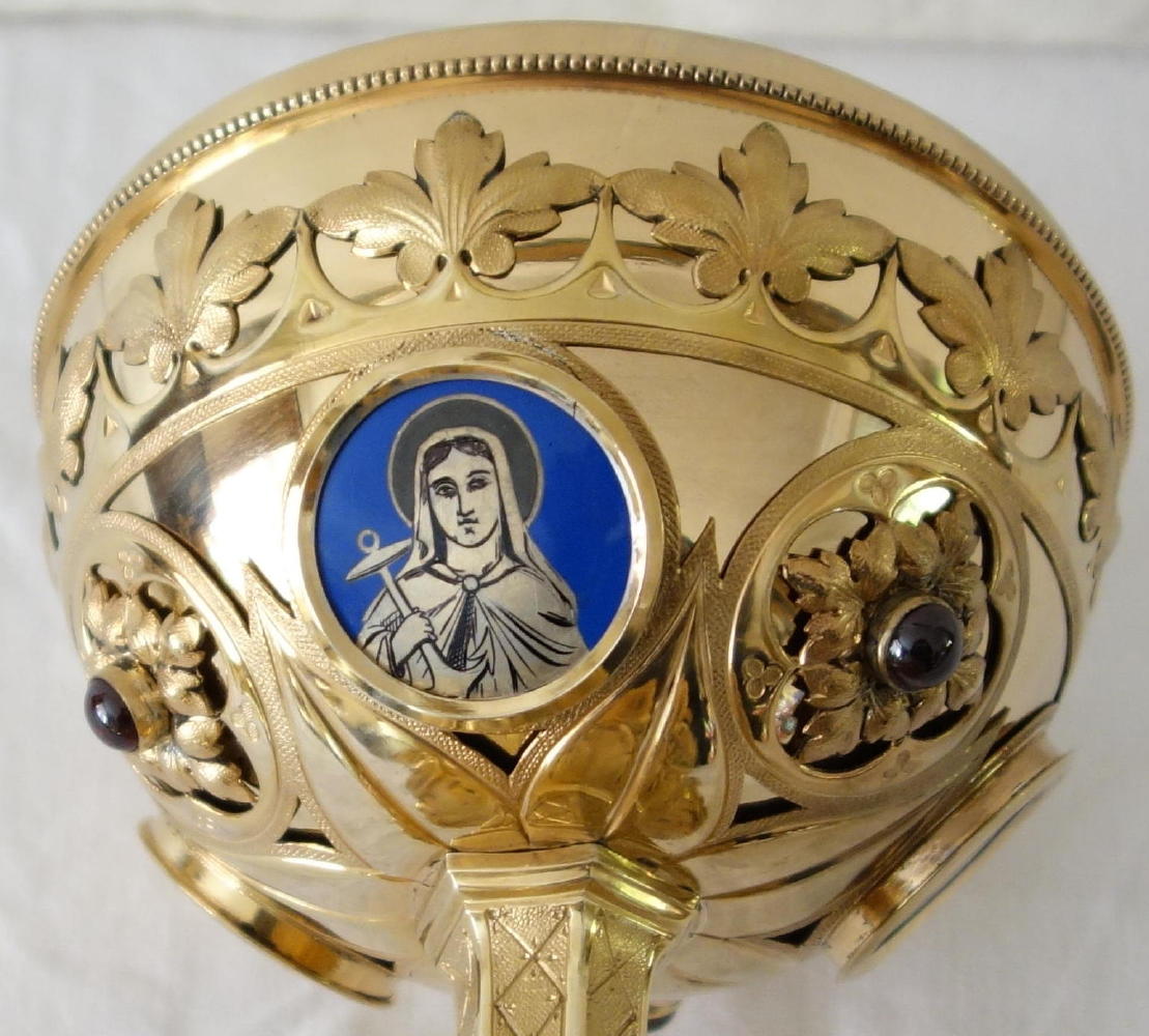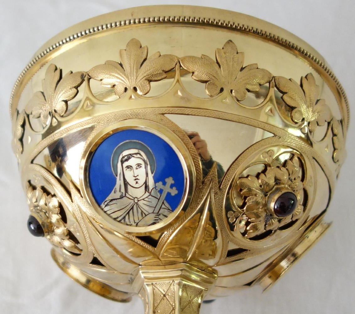The bowl has a calix made in decorative work. Three circular blue and gold enamels depict Faith, Hope and Charity, with coloured stones set between.