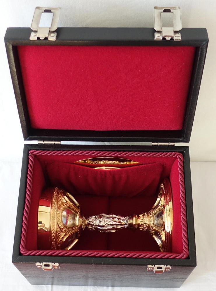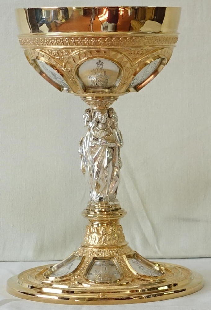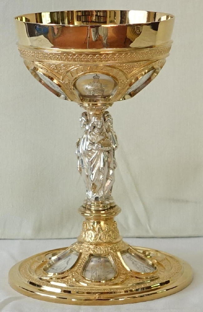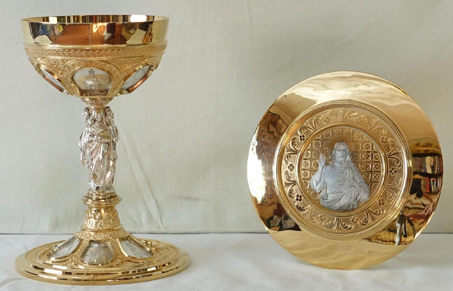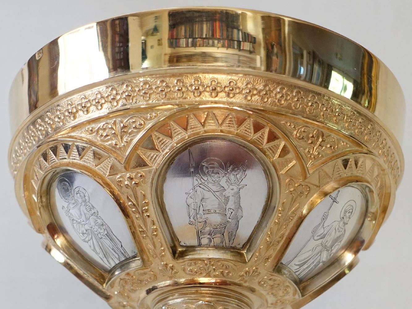 The Chalice is in Romanesque style; the cup & base are finished with fine silver engraved images of Saints. In between these images is fine decorative work.
