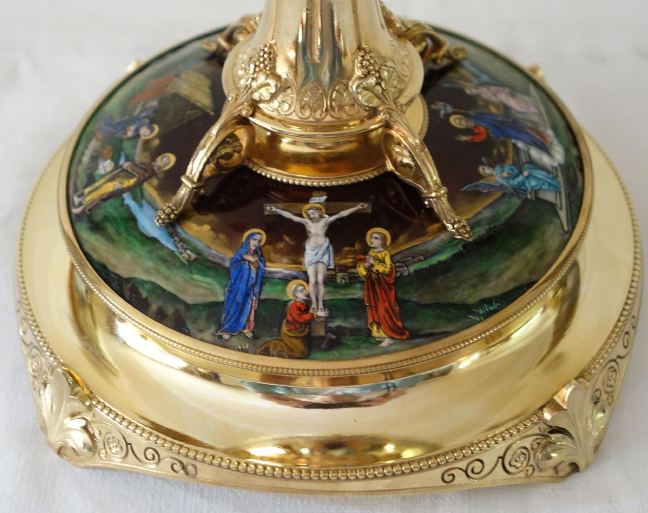 Round the top part of the base is worked a continuous frieze of coloured enamels. The design depicts The Annunciation, The Nativity, The Crucifixion and The Resurrection, all worked in one circular scene.
