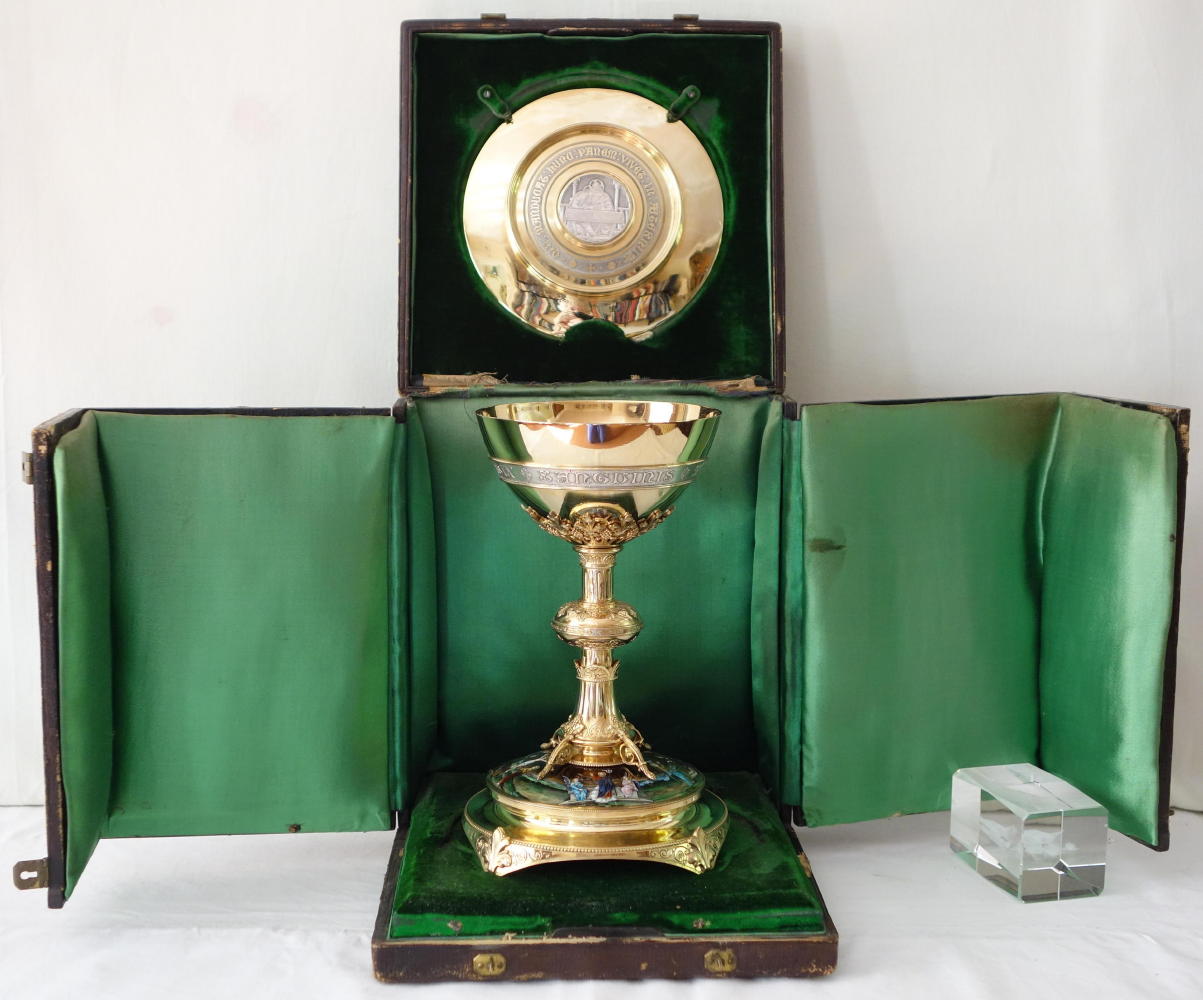 Antique French Romanesque Chalice and Paten in solid silver gilt.