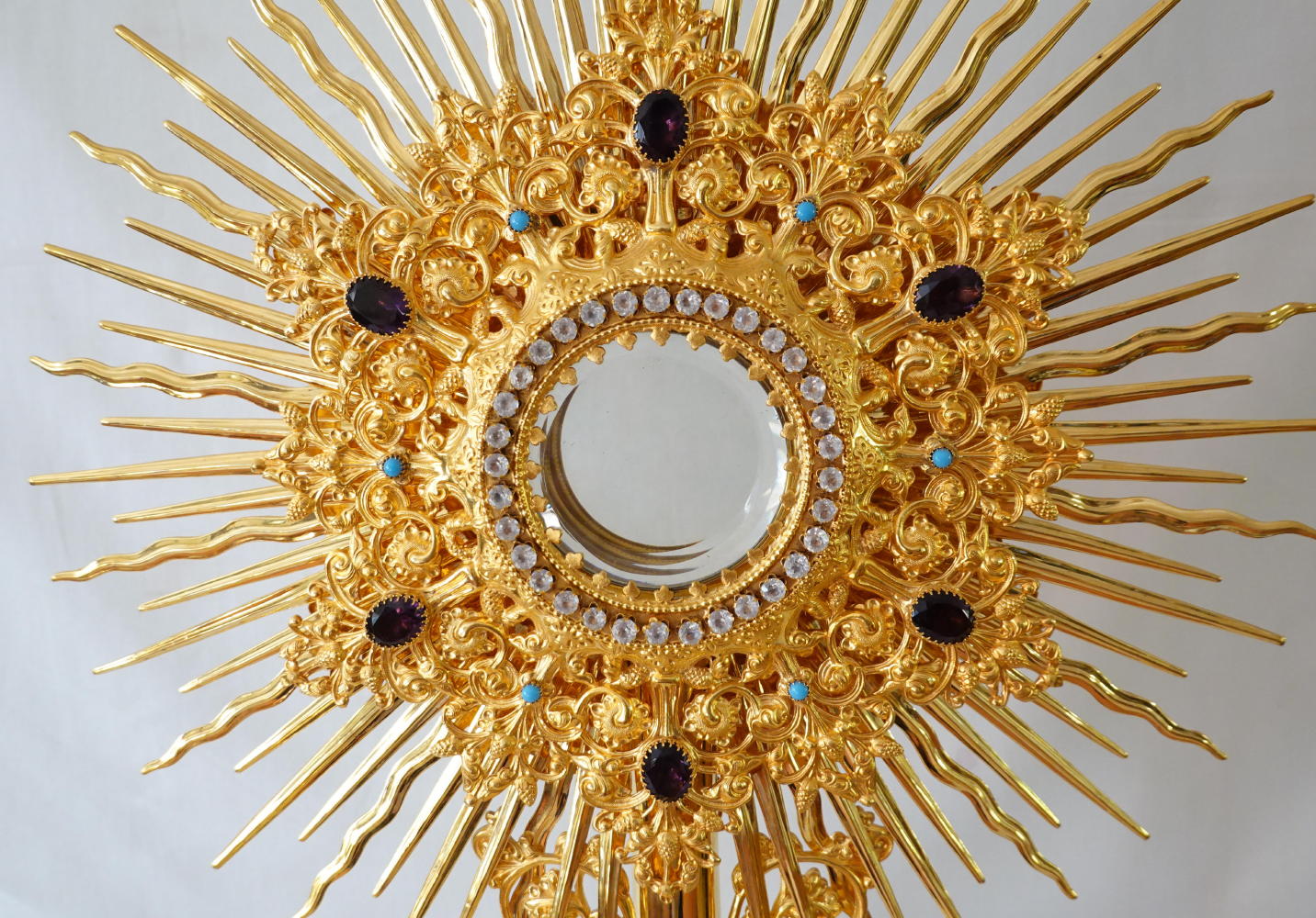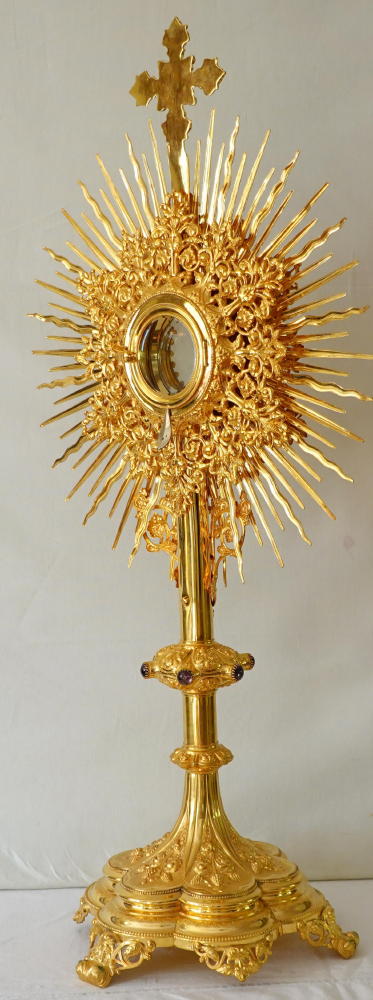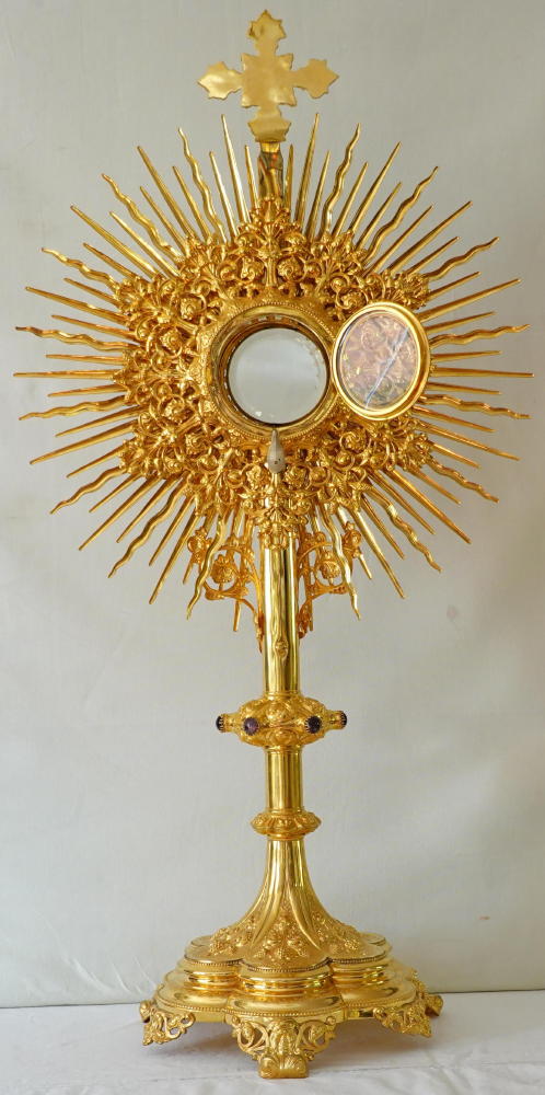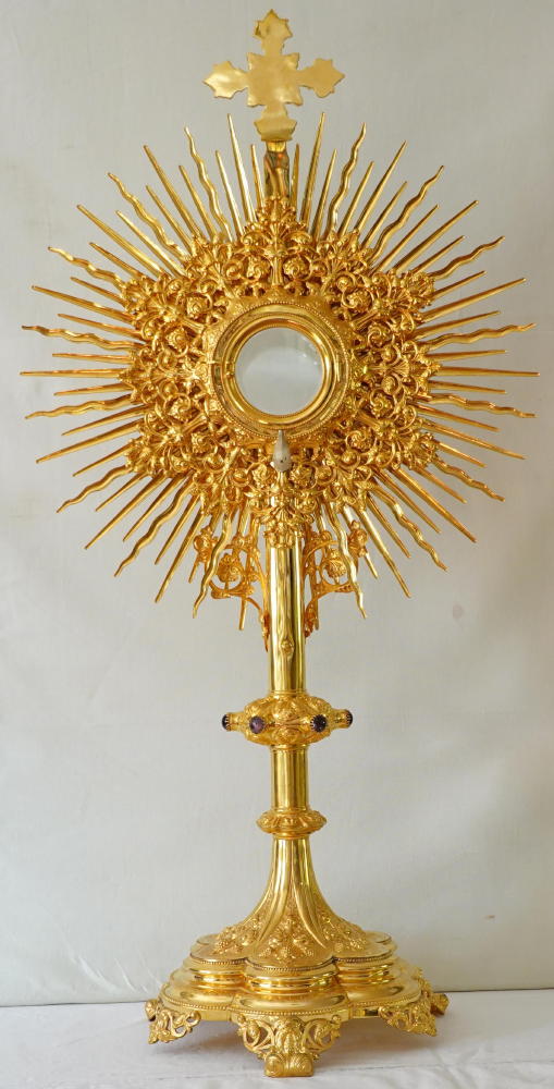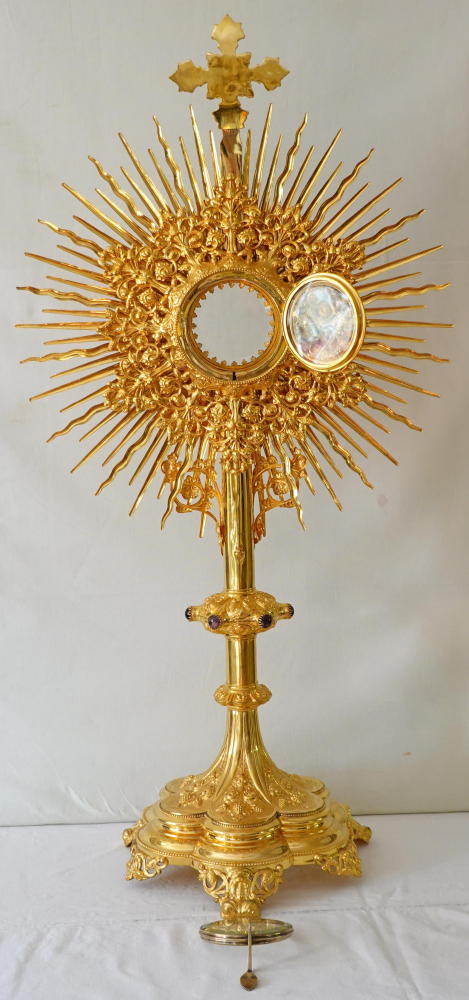 The Monstrance comes complete with the original solid silver gilt Lunette, enclosed with glass to both sides. It fits the Monstrance well.
