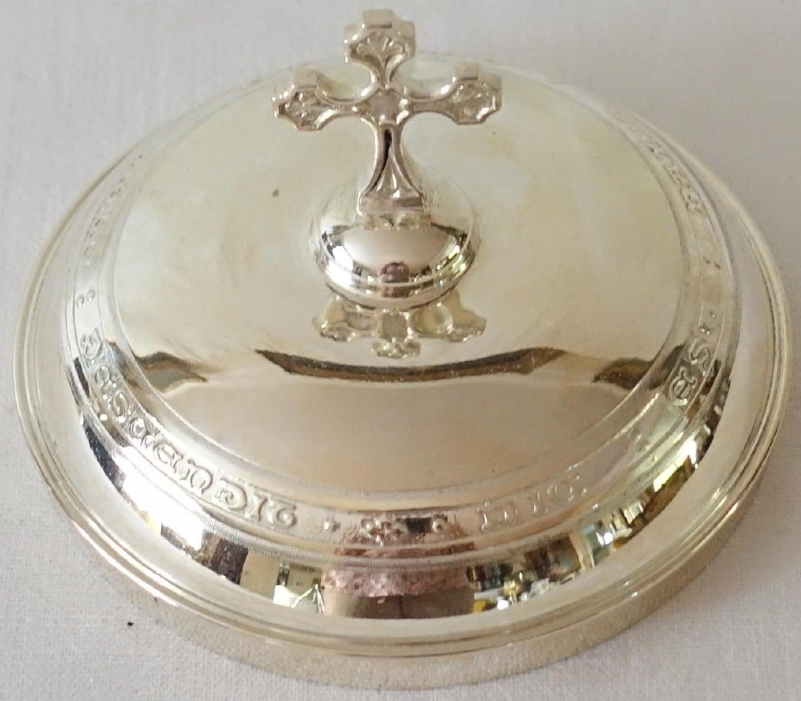 The lid has an engraved frieze round reading 'Hic Est Panis Qui De Caelo Descendit'. The lid is surmounted with a decorative cross.