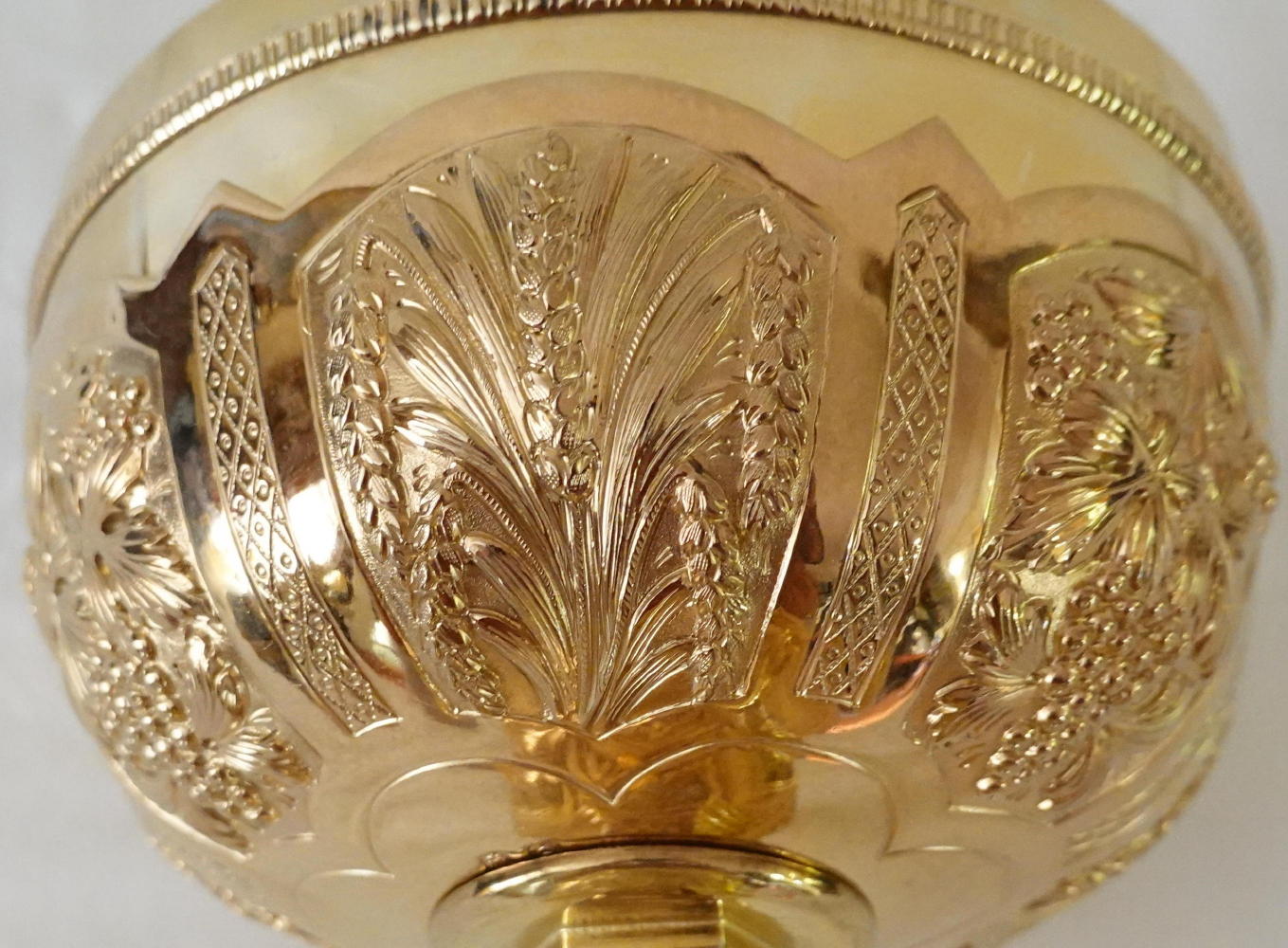 The calix to the bowl has six larger panels, also with the wheat and grapes alternating, with decoration between.