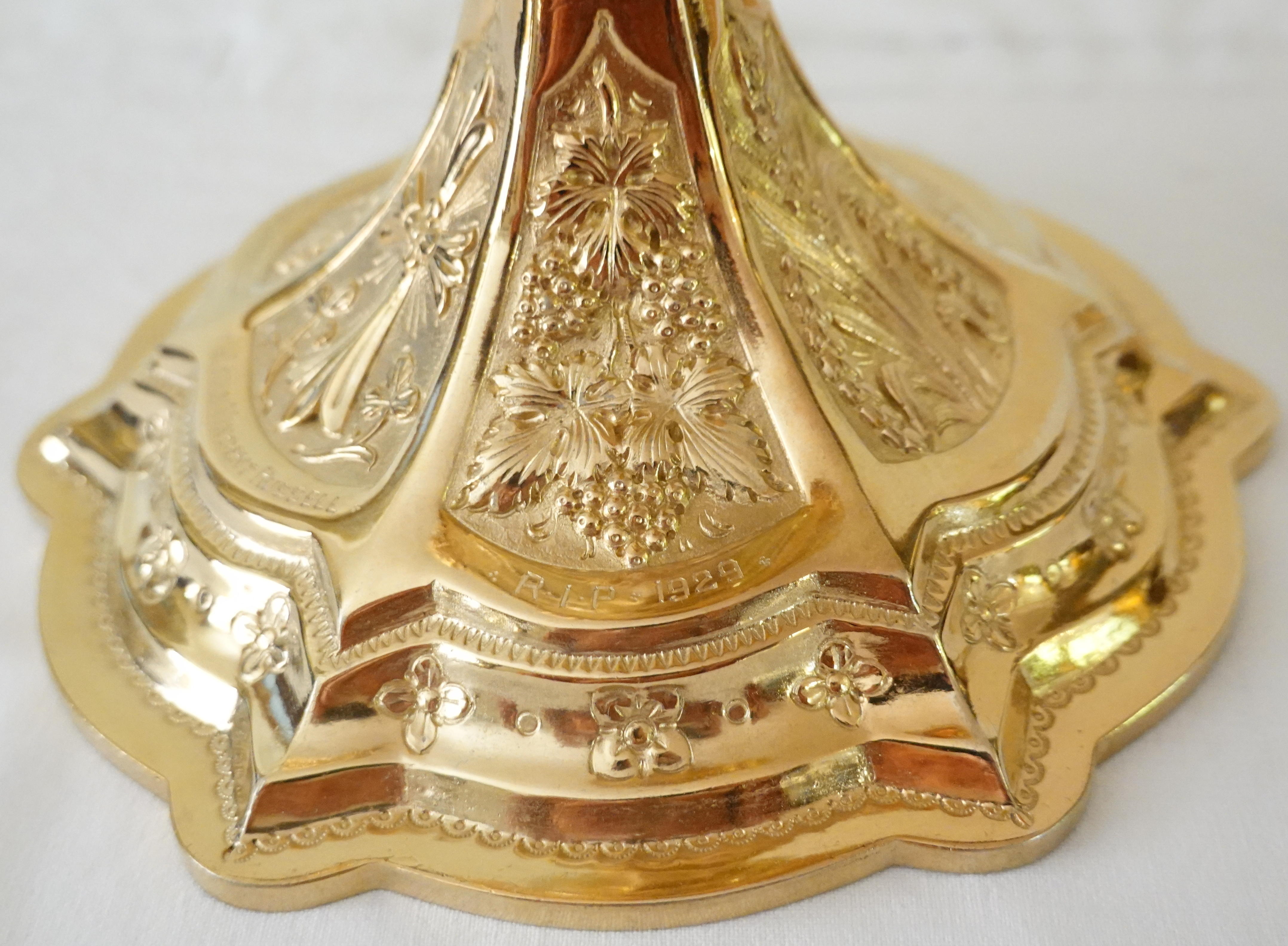 The hexagonal stem is engraved in Gothic style. The central circular knop has six oval images of wheat and grapes worked in ovals.