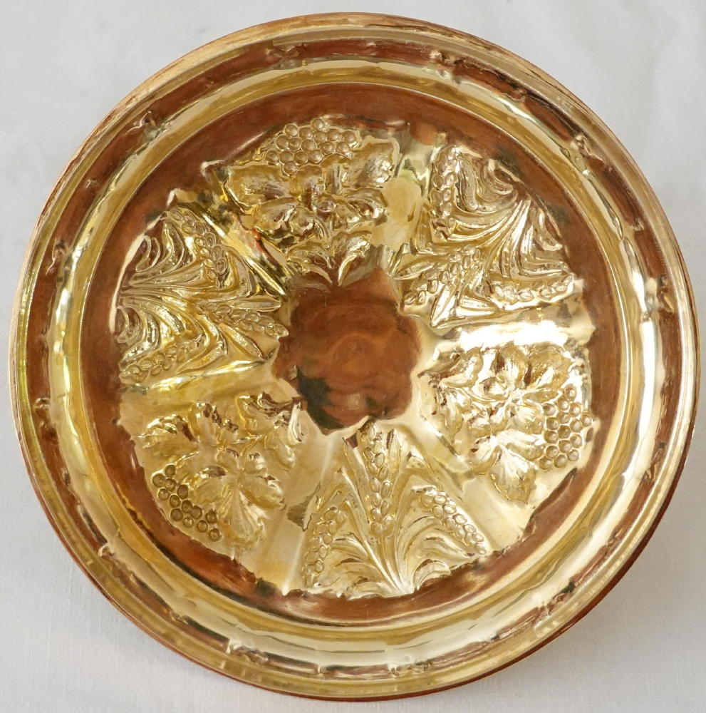 The lid itself is divided into six panels, worked with images alternating between wheat and grapes. The edge of the lid has small engraved flowers all round.