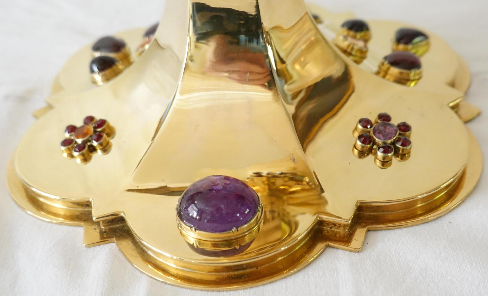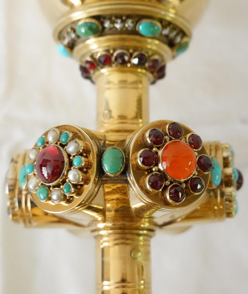 The Chalice is elaborately set with gem stones throughout the base & stem. The stones include turquoise, amber, amethyst and pearl amongst others.