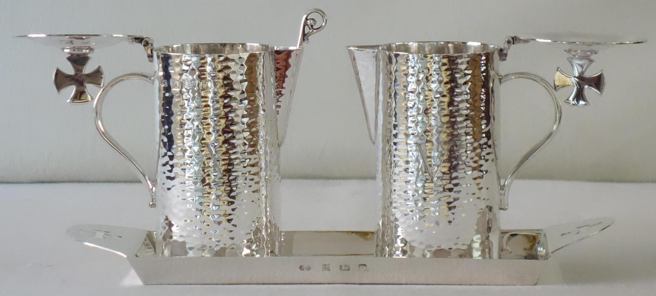 The two cruets have a hammer beaten finish throughout. The cross on top opens the hinged lid to each.