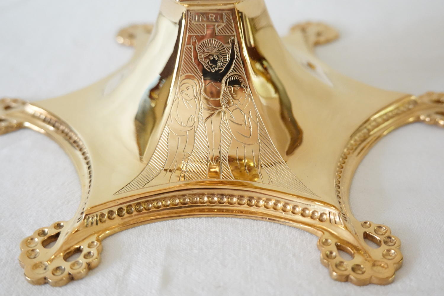 The hexafoil petalled base has an engraving of The Crucifixion with Our Lady and St John to one petal.