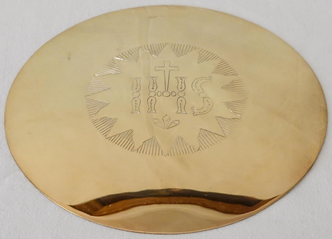 The matching dish shaped Paten is in solid silver, gilded all over. It has an engraved Gothic style IHS with cross and it fits the Chalice well.
